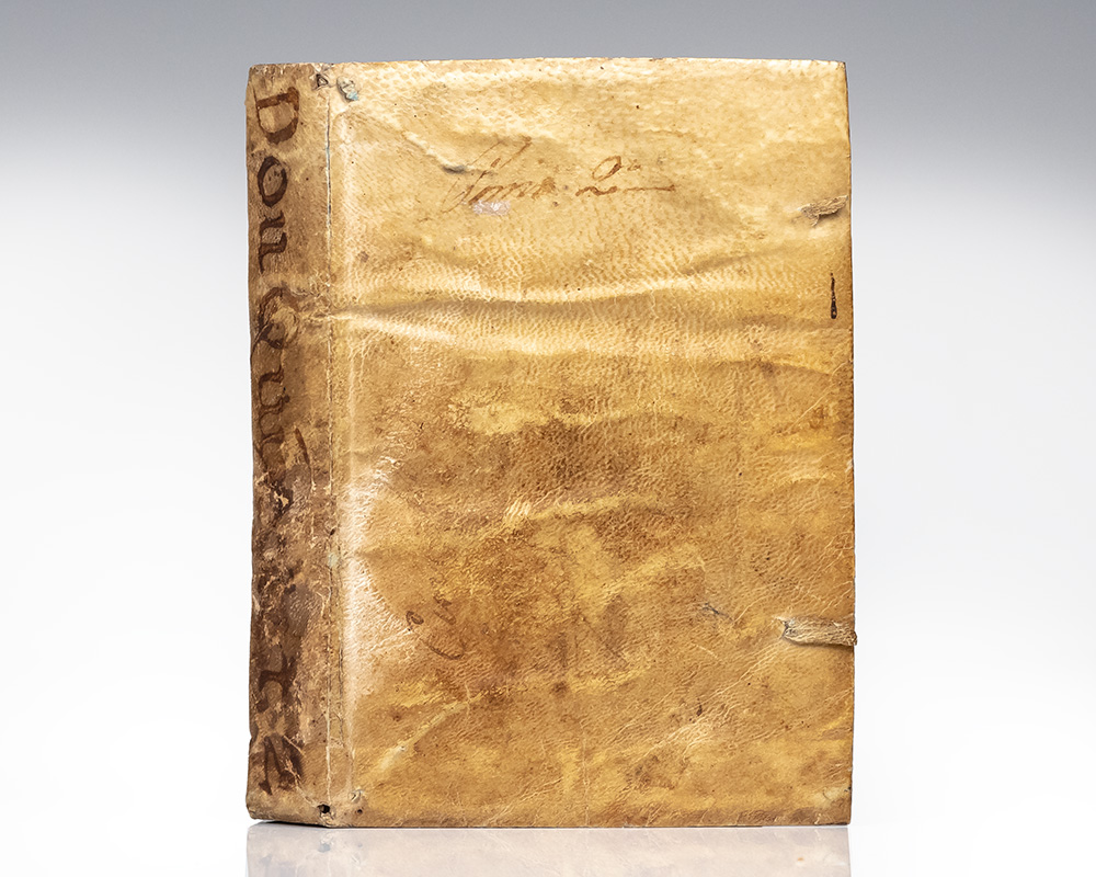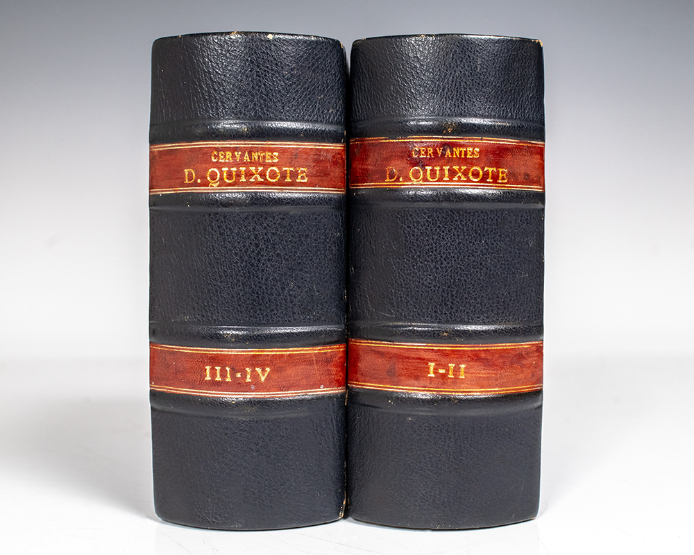 Eighteenth century finely bound example of Cervantes’ masterpiece “which is to Spanish literature what Shakespeare is to English” (Bloom). Duodecimo, four volumes, bound in full uniform contemporary limp parchment, woodcut title page vignettes, illustrated with woodcuts throughout. In very good condition. Housed in two custom board book boxes with morocco spine fronts. Ownership inscriptions to the front pastedowns of the first two volumes. From the collection of Ken Rapoport with his ownership plates to the front pastedowns of each volume. An exceptional presentation.