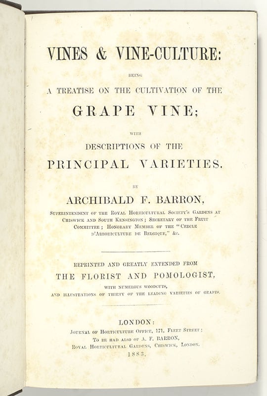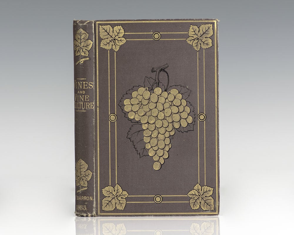 Rare example of Barron's authoritative work on viticulture. Octavo, original publisher's cloth richly decorated in gilt with gilt titles to the spine, central grape bunch motif to the front panel within double gilt ruling with grape leaf cornerpieces. Illustrated with numerous woodcuts and illustrations of thirty grape varieties. In near fine condition. Armorial bookplate to the pastedown.