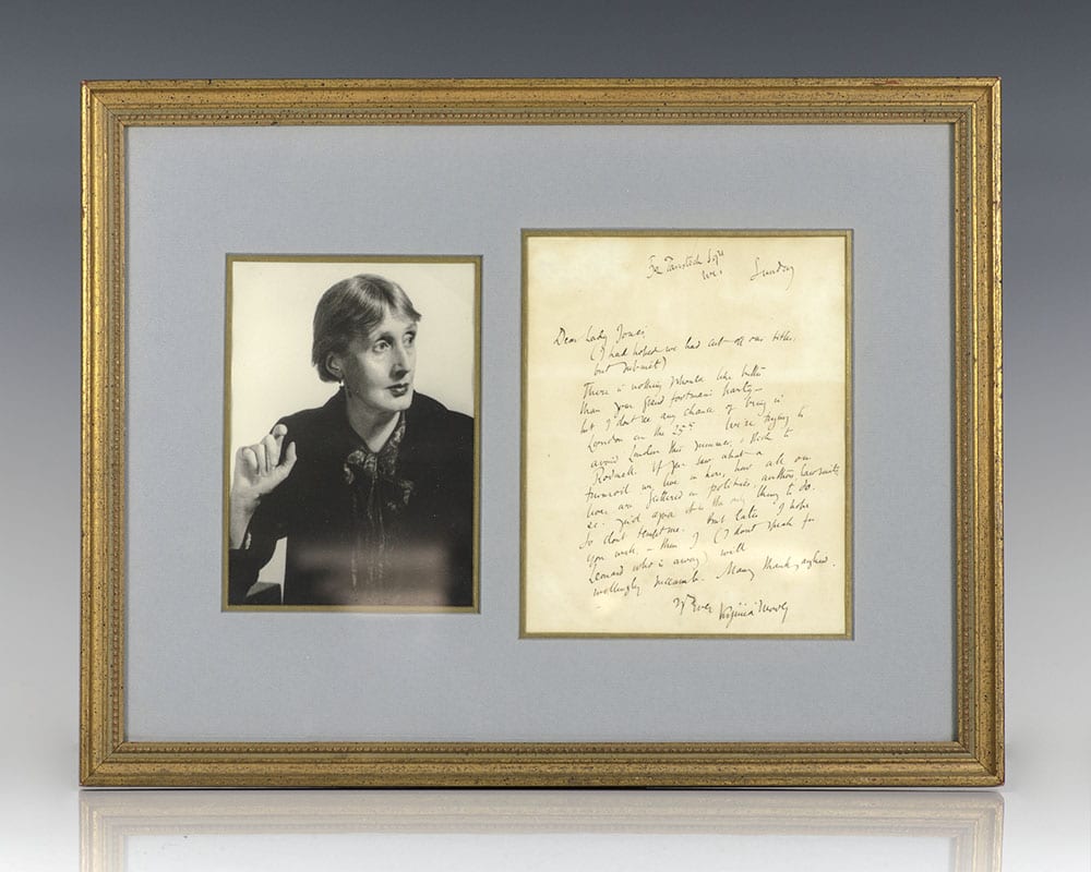 Rare original letter signed and entirely in the hand of Virginia Woolf. The letter reads, "Dear Lady Jones, (I had hoped we had cut off our titles, but submit) There is nothing I should like better than your grand footman's party - but I don't see any chance of being in London on the 25th. We're trying to avoid London this winter and stick to Rodmell. If you saw what a turmoil we live in here, how all our lives are littered in politics, author lawsuits...so don't tempt me. But later I hope you will...then I (I don't speak for Leonard who is away) willingly succumb. Many thanks ahead. Yours Ever Virginia Woolf." Virginia and her husband Leonard bought Monk's House Cottage in the village of Rodmell in 1919 where the received many fellow English writers and intellectuals including T. S. Eliot, E. M. Forster, Roger Fry and Lytton Strachey. Double matted and framed with a portrait of Woolf. The entire piece measures 17.5 inches by 13.5 inches. Rare and desirable.