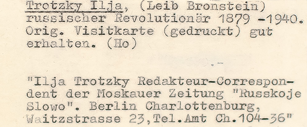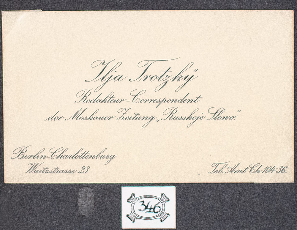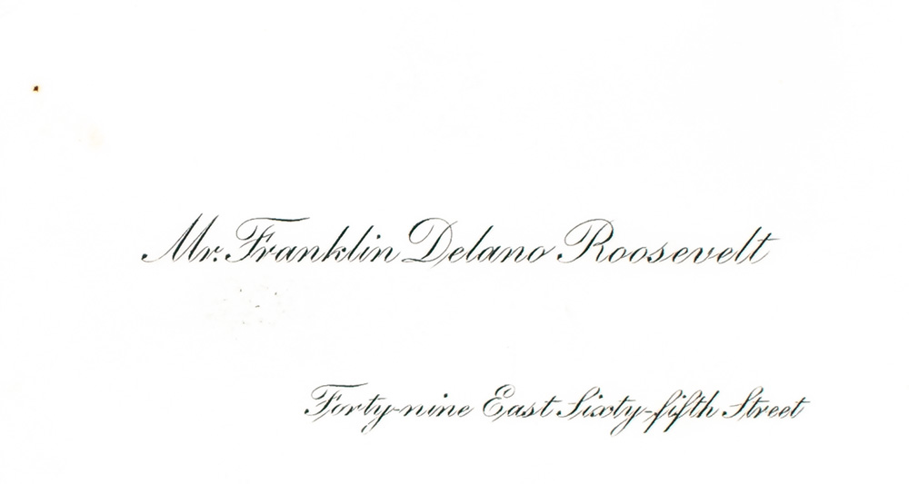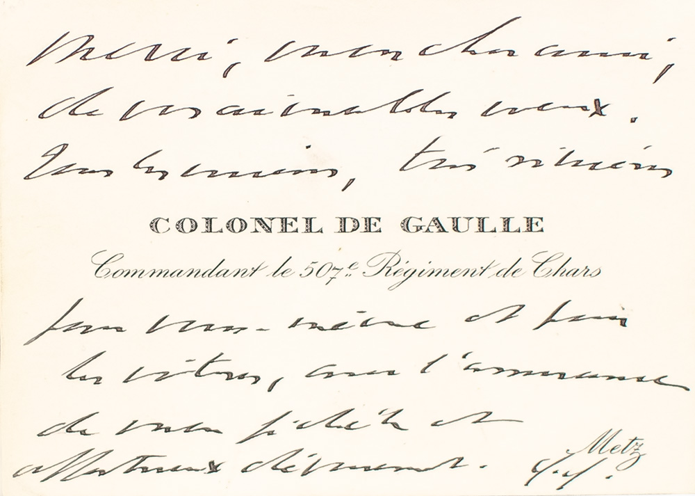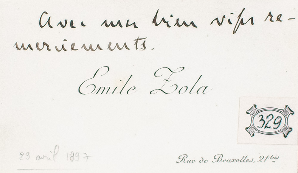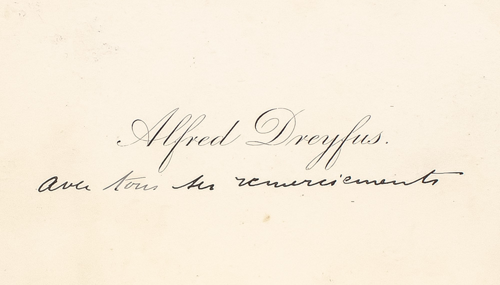 Rare collection of seven printed visiting cards. The collection includes: Alfred Dreyfus, inscribed by him in ink, "avec tous les remerciements," n.d., 2.25 inches by 3.8 inches; Colonel De Gaulle as Commandant le 507e Regiment de Chars, inscribed by him in ink, "Merci, mon cher ami..." n.d. but after December 1937 when he was promoted to Colonel, 2.5 inches by 3.5 inches; Theodore Roosevelt at Sagamore Hill, Oyster Bay, L.I., inscribed by him in ink, "Mr Roosevelt greatly regrets that he can not accede to your courteous request," n.d., 1.5 inches by 3 inches; Emile Zola at Rue de Bruxelles, Paris, inscribed by him in ink, "Avec mon bien vifs remerciements" and dated in pencil in another hand, "29 avril 1887," bearing collection label numbered '329,' 2.5 inches by 4 inches; Mr. Theodore Delano Roosevelt at Forty-nine East Sixty-fifth Street, n. d., 2 inches by 3.3 inches; Mrs. Franklin Delano Roosevelt [Eleanor Roosevelt] at the Executive Mansion, n. d., 2.5 inches by 5 inches; Ilya Trotzky, 'Redakteur-Correspondent der Moskauer Freitung 'Russkoje Slowo' at Berlin-Charlottenburg, bearing collection label numbered '346', n.d., 2.6 inches by 4.3 inches. In near fine to fine condition with a closed tear to Theodore Roosevelt's inscribed card which has been expertly repaired, slight scuffing to the top right corner of Dreyfus' card where it had been mounted by a previous owner. Accompanied by a typed information card about Ilya Trotzky's card.