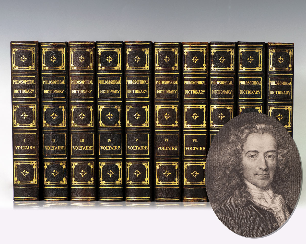 Finely bound set of Voltaire's famed Dictionnaire philosophique; the culmination of his views on Christianity, God, and morality. Octavo, ten volumes, bound in three quarter pebbled morocco over marbled boards, gilt titles and tooling to the spine, marbled endpapers, title page in red and black. In very good condition.