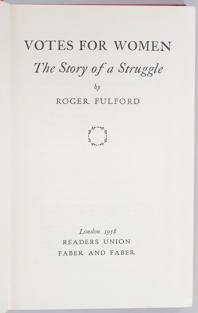 Reader's Union edition of Fulford's work on the UK women's suffrage movement. Octavo, original cloth. English journalist, historian, writer and politician Roger Fulford authored several important biographies and other works. Between 1964 and 1981 he edited five volumes of letters between Queen Victoria and the Princess Royal. He was President of the Liberal Party from 1964 to 1965. In very good condition.
