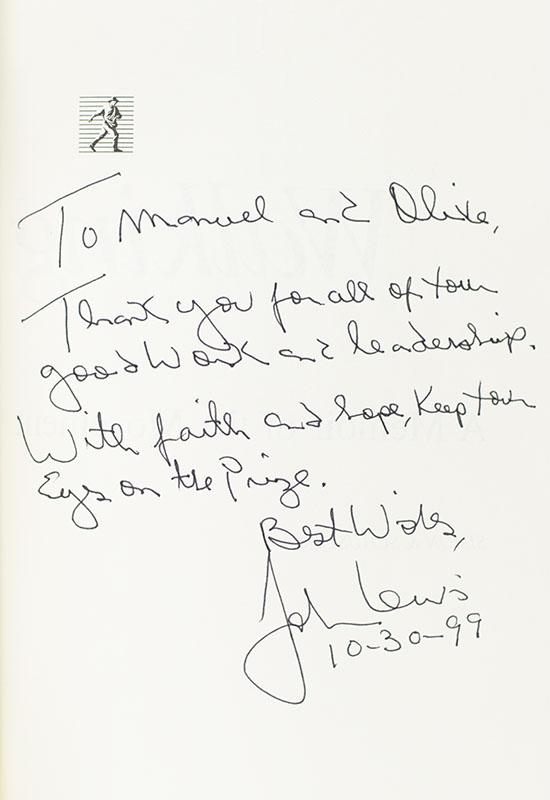 First edition, early printing of Congressman Lewis' pivotal account of the Civil Rights movement that transformed America. Octavo, original half cloth, with 16 pages of black-and-white photographic illustrations. Presentation copy, inscribed by the author on the half-title page, "To Manual and Olive, Thank you for all of your good words and leadership. With faith and hope, Keep your Eyes on the Prize. Best Wishes John Lewis 10-30-99." Fine in a fine dust jacket. Jacket design by Jackie Seow. Jacket photograph by Danny Lyon. Written with Michael D'Orso.