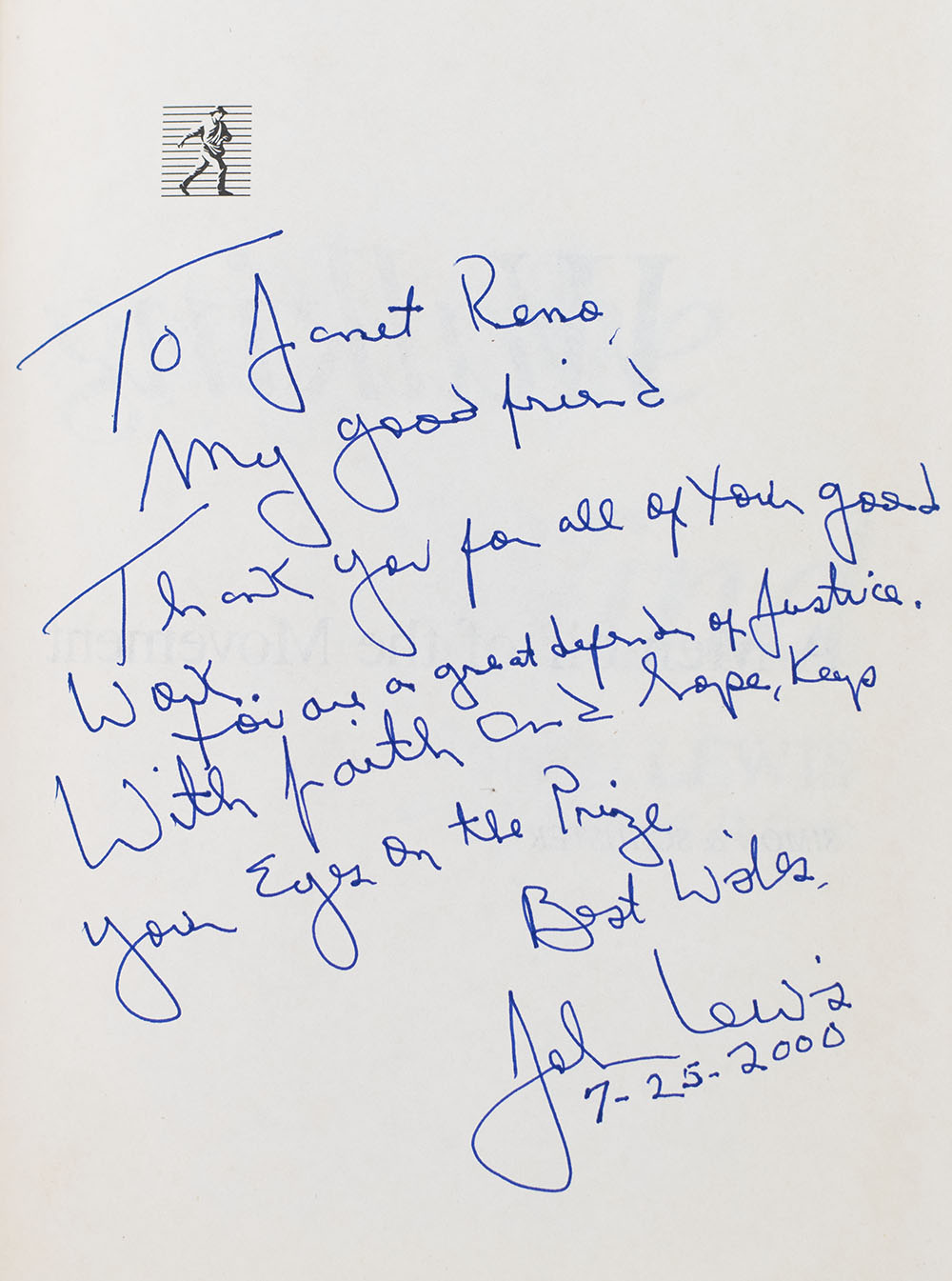 "To Janet Reno, My good friend Thank you for all of your good work. You are a great defender of Justice. With faith and hope, keep your Eyes on the Prize"; FIRST EDITION OF CONGRESSMAN JOHN LEWIS' POWERFUL MEMOIR, WALKING WITH THE WIND, WARMLY INSCRIBED BY HIM TO ATTORNEY GENERAL OF THE UNITED STATES JANET RENO