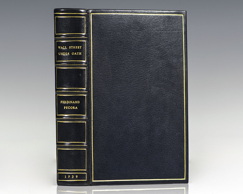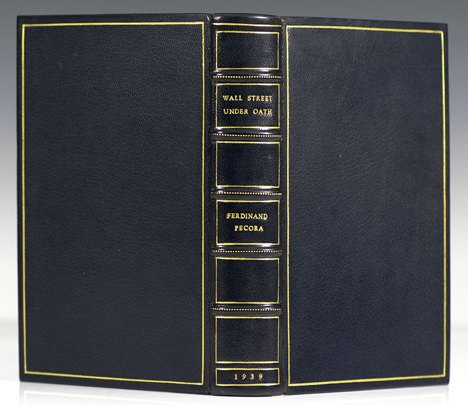 First edition of Pecora’s account of his role as chief counsel in the dramatic 1930s Senate hearings on Wall Street’s role in the 1929 Stock Market Crash. Octavo, bound in full morocco, gilt titles and ruling to the spine, raised bands, double gilt ruled to the front and rear panels, gilt signature to the front panel, marbled endpapers, all edges gilt. In fine condition.
