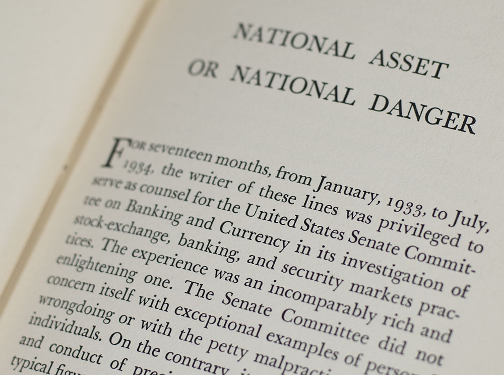Ferdinand Pecora was appointed Chief Counsel to the U.S. Senate's Committee on Banking and Currency in January 1933. The Senate committee hearings that Pecora led probed the causes of the Wall Street Crash of 1929 that launched a major reform of the American financial system. After Pecora closed his investigations, on July 2, 1934, President Roosevelt appointed Ferdinand Pecora a Commissioner of the newly formed U.S. Securities and Exchange Commission (SEC). In 1939 Pecora wrote a book about the Senate investigations titled Wall Street Under Oath: The Story of Our Modern Money Changers. On January 21, 1935, Pecora resigned from the SEC and became a judge of the New York State Supreme Court, a position he held until 1950.