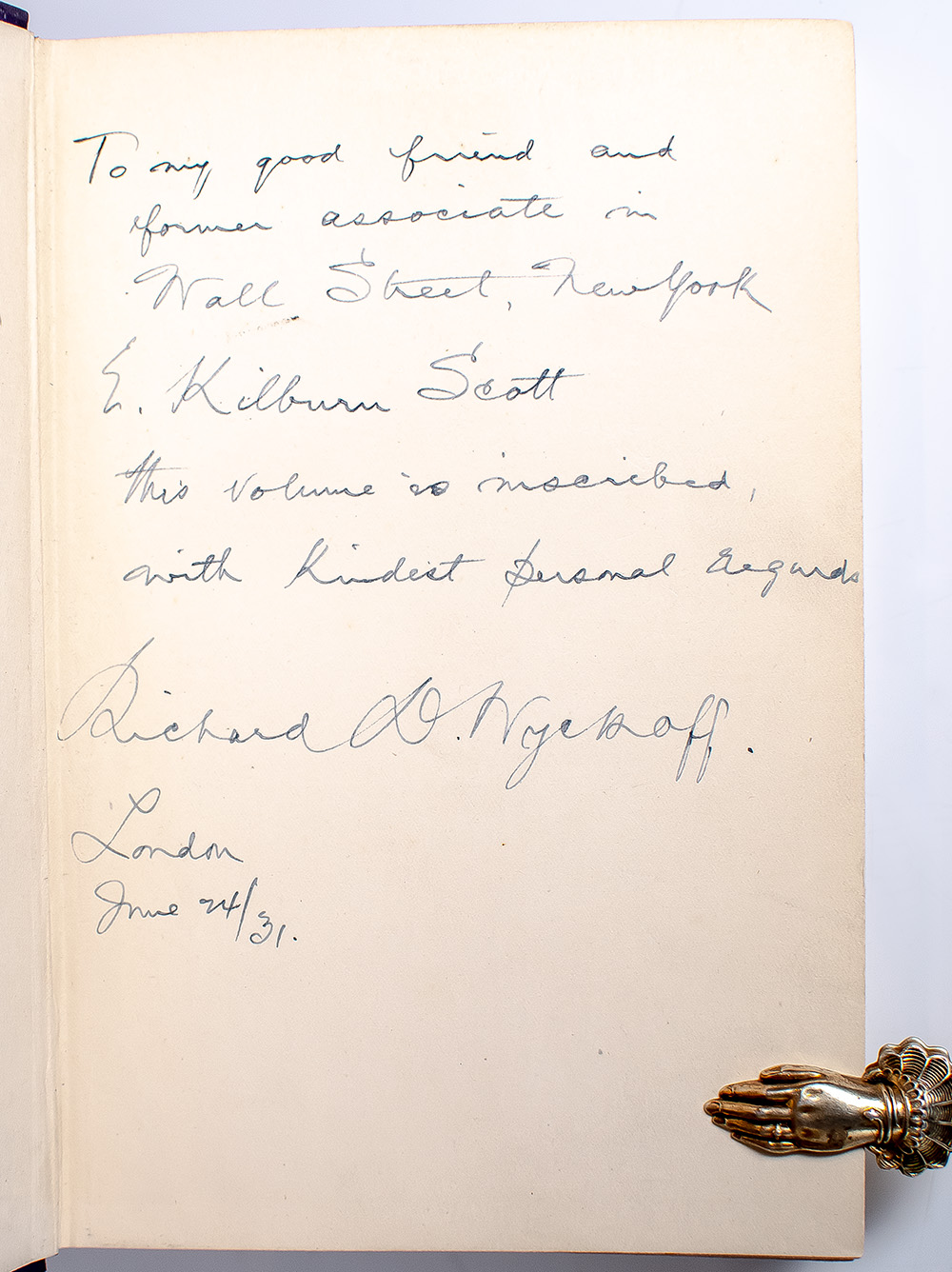 First edition of this classic work by Wyckoff who implemented his methods of technical analysis of the financial markets (the study of charts showing movements of stock-prices and other data). Octavo, original cloth. Presentation copy, lengthily inscribed by the author on the front free endpaper, "To my good friend and former associate on Wall Street, New York E. Kilburn Scott this volume is inscribed, with kindest personal regards Richard D. Wyckoff London June 24/31." Very good in the rare original dust jacket, which is in very good condition. Housed in a custom house morocco clamshell box made by the Harcourt Bindery. Books signed and inscribed by Wyckoff are rare.