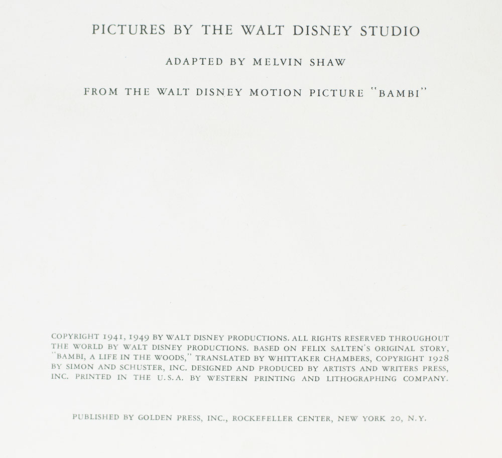 "This is quite an occasion. It isn't often that a Prince is born in the forest": First Big Golden Book edition of Walt Disney's Bambi; inscribed by Walt Disney