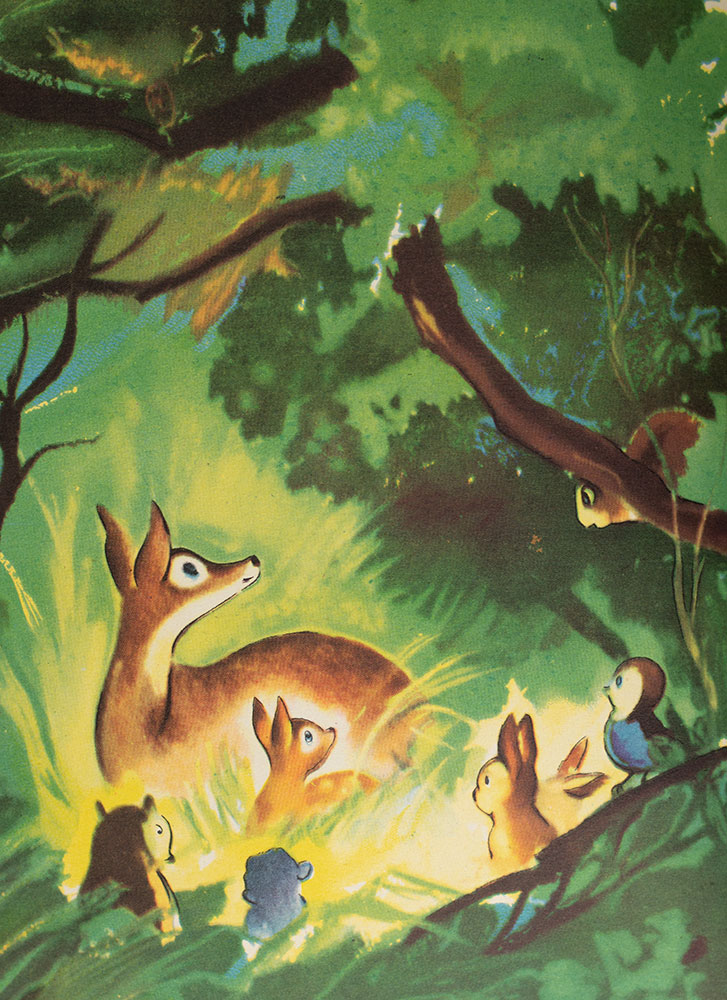 Pre-production for Walt Disney’s adaptation of Felix Salten’s classic tale began as early as 1936 and was intended to be Disney’s second full-length animated film after Snow White (1937). His insistence on perfection and quest for realism, however, delayed the project significantly, so that four other Disney films were released before Bambi in 1942. Bambi was animated by Disney’s legendary “nine old men”— including Frank Thomas, Ollie Johnston, Marc Davis, Milt Kahl and Eric Larson. Designed to promote the movie, the storybook version of Bambi features 14 full-page color images from the film and 54 in-text half-tone cartoons.