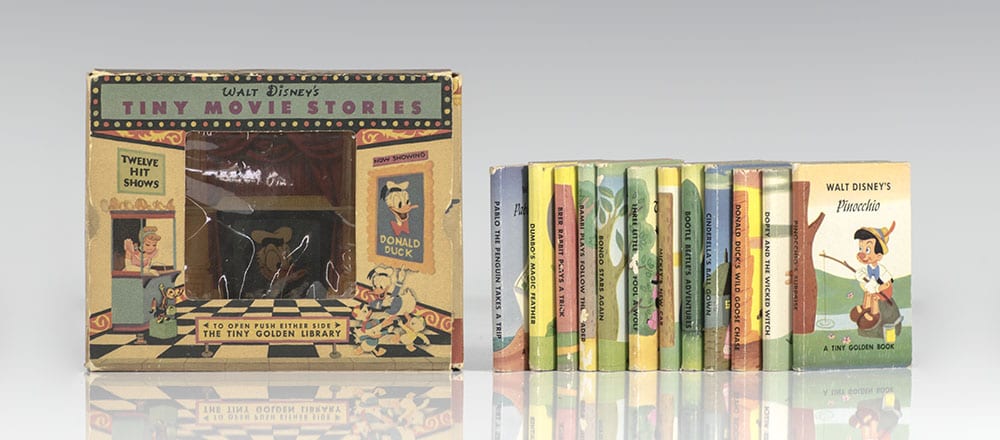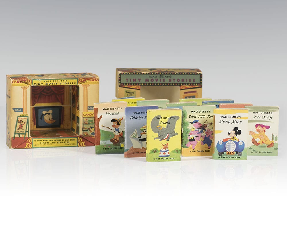 Scarce first edition collection Disney's Tiny Movie Stories. 12mo, 12 volumes, illustrated. Housed in the original publisher's pictorial box designed as a tiny movie theater with the cellophane window present. Stand-up figure of Mickey mouse on the top of the box in its original un-punched state. In near fine condition. Designed and produced by The Sandpiper Press and Artists and Writers Guild, Inc. Scarce and desirable, especially in this condition.