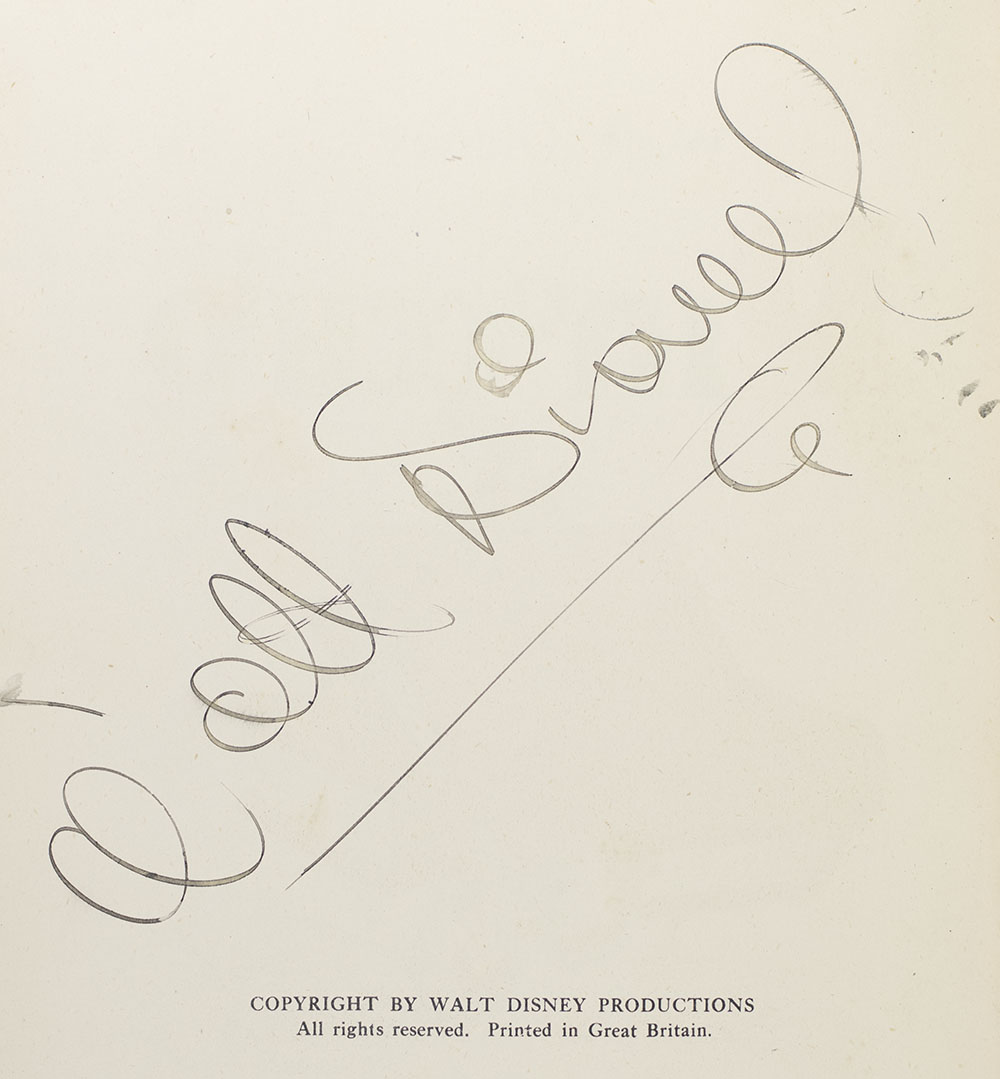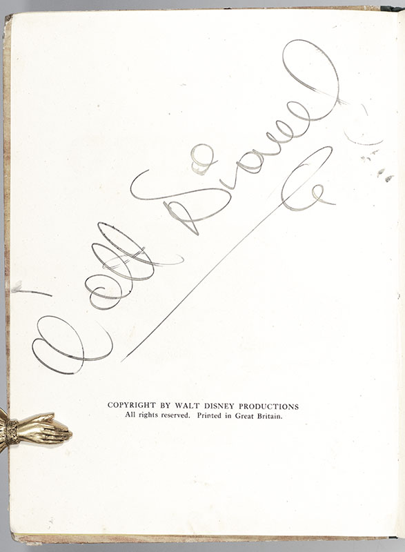 First English edition of the book version of Walt Disney’s second feature-length animated motion picture. Quarto, original half cloth over illustrated boards, pictorial endpapers, illustrated. Boldly signed by Walt Disney on the verso of the title page. In very good condition. Housed in a custom half morocco clamshell box. Rare signed by Walt Disney.