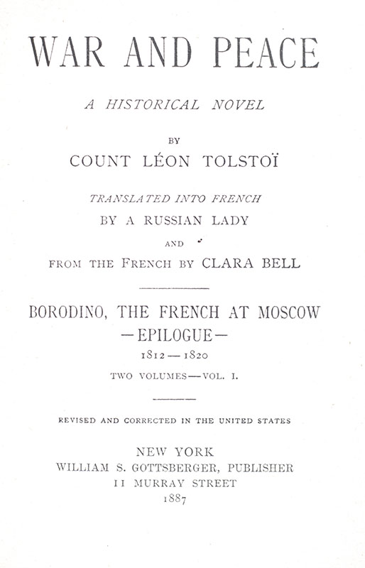 First American edition, early printings of Tolstoy's masterpiece. Small octavo, six volumes, original wrappers. Translated from the French edition by Clara Bell. In very good condition with some rubbing and wear to the extremities. Exceptionally rare in the original wrappers, with no examples traced at auction in the last 80 years.