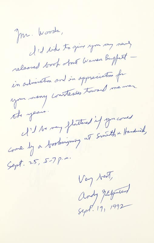 First edition of this early biography on investing legend Warren Buffett. Octavo, original half cloth. Presentation copy, inscribed by the author on the front free endpaper with a full page inscription, "Mr. Woods, I'd like to give you my newly released book about Warren Buffett- in admiration and in appreciation for your many courtesies toward me over the years. I'd be very flattered if you could come by a booksigning at Smith and Hardwick, Sept. 25, 5-7 p.m. Very best Andy Kilpatrick Sept. 19, 1992." Additionally signed by Warren Buffett on the half-title page. Fine in a fine dust jacket. Jacket design by Mike Stromberg. Author photograph by E. Kent Oztekin.