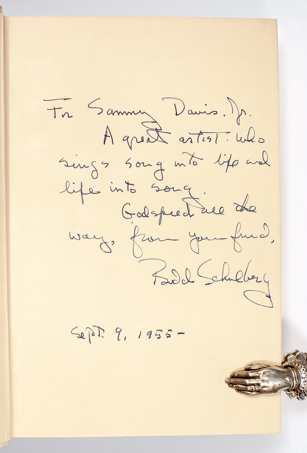 First edition of the novelization of Schulberg's Academy Award–winning screenplay for the classic 1954 film On the Waterfront. Octavo, original publisher's cream cloth. Association copy, inscribed by the author on the front free endpaper to Sammy Davis, Jr. in the year of publication, "For Sammy Davis Jr. A great artist who sings songs into life and life into song. Godspeed all the way, from your friend, Budd Schulberg Sept. 9 1955." The recipient, Sammy Davis Jr. was a prominent American entertainer whose career encompassed a range of disciplines including music, film, and theater. Emerging from the vaudeville tradition, Davis achieved notable success in the mid-20th century through his performances in various genres, including jazz, pop, and Broadway. His association with the Rat Pack, alongside figures such as Frank Sinatra and Dean Martin, further established his position within the entertainment industry. Davis's career was marked by both significant professional accomplishments and personal challenges, including issues related to racial discrimination. Additionally inscribed by the author (at a later date) to actor Joe Pantoliano on the title-page, "For Joe Pantoliano, Here we go again. It's an honor to meet his distinguished son of Hoboken. I've enjoyed our talk today. Here's to many more. With my admiration and warmest wishes Budd Schulberg 5/5/06." The recipient, American actor Joe Pantoliano has played over 150 roles across film, television, and theater. He is best known for portraying Ralph "Ralphie" Cifaretto on the HBO crime drama The Sopranos (1999–2007), for which he won a Primetime Emmy Award for Outstanding Supporting Actor in a Drama Series, and Cypher in the sci-fi action film The Matrix (1999). Near fine in a near fine dust jacket without the usual fading to the spine. An exceptional double association copy.