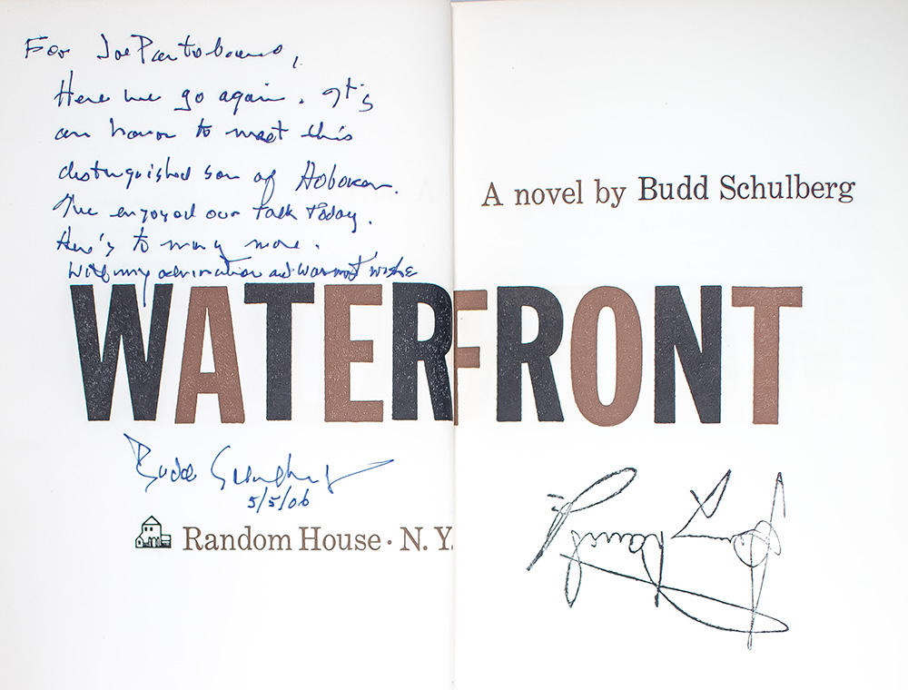 FIRST EDITION, DOUBLE ASSOCIATION COPY of Waterfront; lengthily inscribed by Budd Schulberg to both Sammy Davis Jr. and Joe Pantoliano