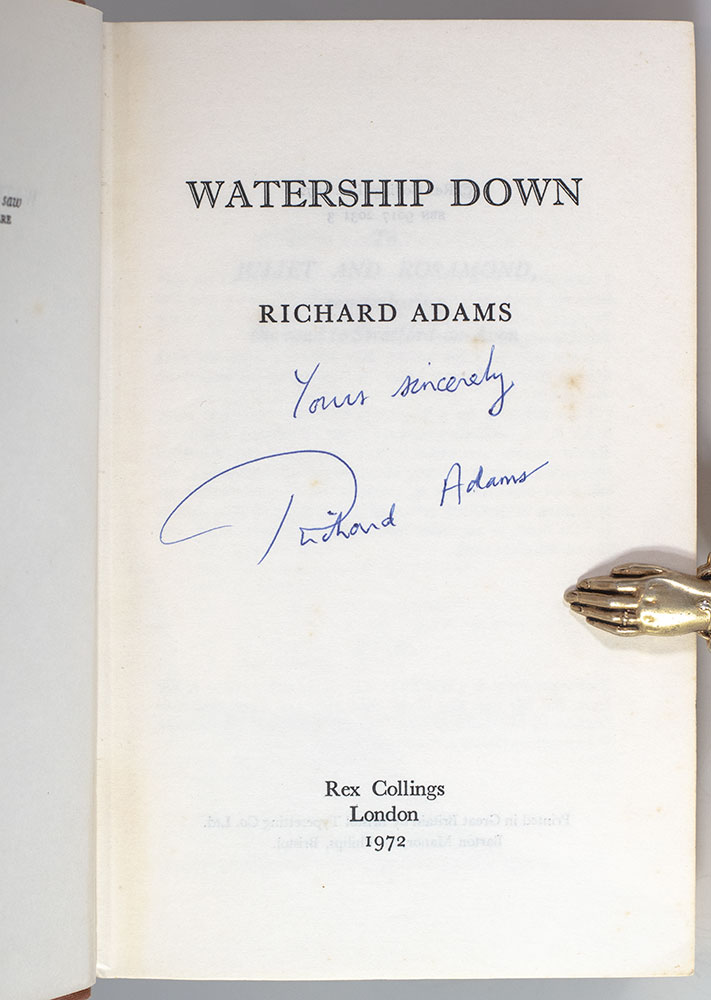 First edition of the author's first and most beloved work. Octavo, original brown cloth, folding map. Boldly signed the author on the title page, "Yours sincerely Richard Adams." Near fine in a near fine dust jacket. Housed in a custom half morocco clamshell box by Asprey. An exceptional example, uncommon signed.