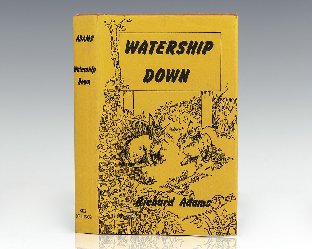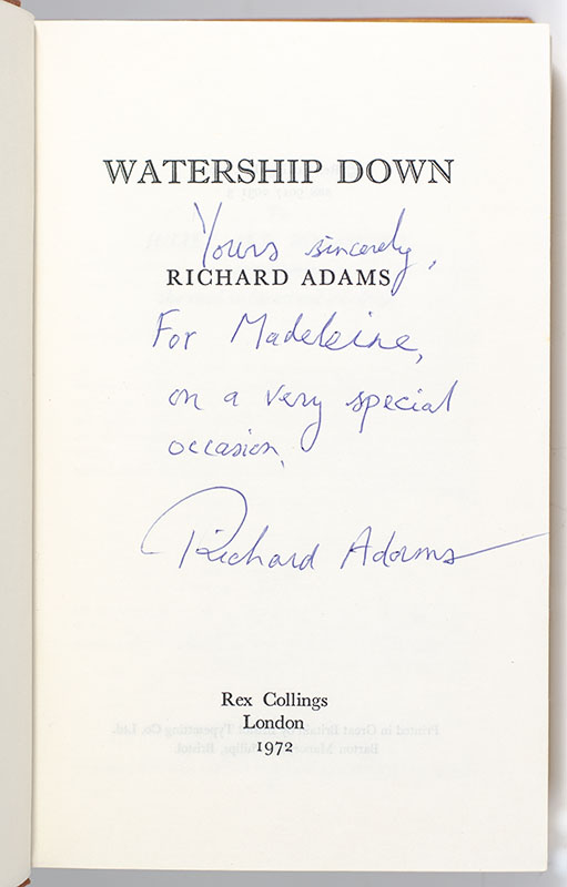 First edition of Richard Adams' timeless classic novel. Octavo, original brown cloth, folding map. Association copy, inscribed by the author on the title page to fellow bestselling children's author Madeleine L'Engle, "Yours sincerely, For Madeleine, on a very special occasion Richard Adams." From the library of Madeleine L'Engle. Both Adams and L'Engle were unknown in the publishing world until their singular best-selling award-winning children's novels were finally published after numerous rejections. Both authors' works were also published in their mid-lives after they had married and had children. At the insistence of his daughters, Adams began writing the story he had told them on a car trip in 1966 at the age of 46 and after four publishers and three writers' agencies turned down the manuscript, Rex Collings agreed to publish the work in 1972. The book gained immediate international acclaim and went on to win the Carnegie Medal, Guardian Prize, and was adapted into several feature films and television series. L'Engle's best-selling work A Wrinkle in Time was also initially rejected by at least 26 publishers. It was not until a close personal friend of L'Engle's mother introduced her to John C. Farrar of Farrar, Straus and Giroux that the work was finally published in 1962. L'Engle was 44 years old at the time of publication and A Wrinkle in Time went on to win the Newbery Medal, the Sequoyah Book Award, the Lewis Carroll Shelf Award, and inspired two film adaptations, both by Disney: a 2003 television film directed by John Kent Harrison; and a 2018 theatrical film directed by Ava DuVernay. Near fine in a near fine price-clipped dust jacket with light shelf wear. Housed in a custom half morocco clamshell box. An exceptional association.