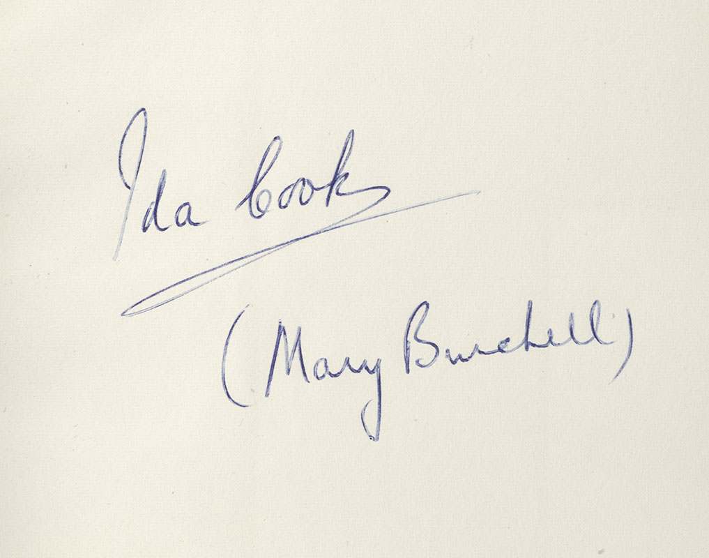 First Mills & Boon edition of the author's autobiography, first published in Great Britain in 1950 by Hamish Hamilton. Octavo, original cloth, illustrated. Signed by the author on the front free endpaper with both her given and pen name, "Ida Cook (Mary Burchell)." Near fine in a very good dust jacket. Jacket design by Rosemary Slattery. Books signed by Burchell are rare.