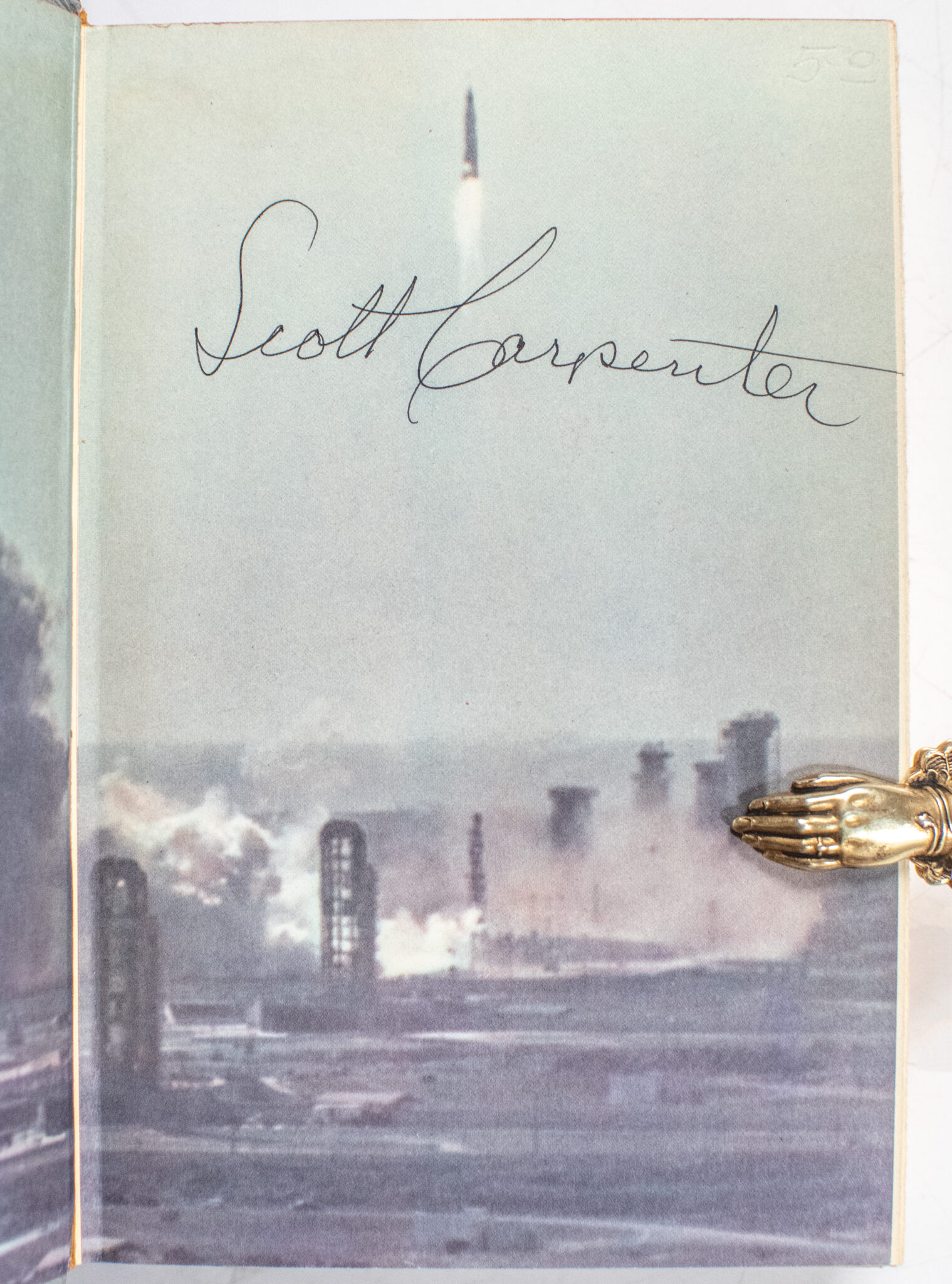 First edition, early printing of this first-hand account of the genesis of America’s manned space program. Octavo, original half-cloth, top stain orange, pictorial endpapers, illustrated with black and white photographs. Boldly signed by Mercury Seven astronaut Scott Carpenter on the front free endpaper. Near fine in a very good dust jacket with chipping. Jacket design by Paul Bacon.