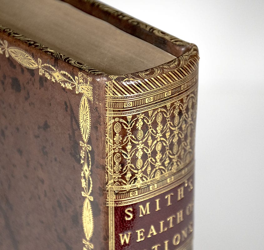 First edition of Adam Smith's magnum opus and cornerstone of economic thought. Quarto, 2 volumes. Bound in full brown calf, elaborately gilt-decorated spines, front and rear panels, red morocco spine labels, marbled endpapers. In near fine condition. Remarkably clean throughout with some light toning. An exceptional example of this landmark work.
