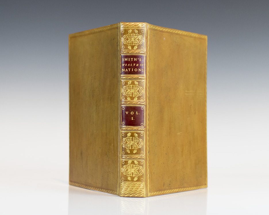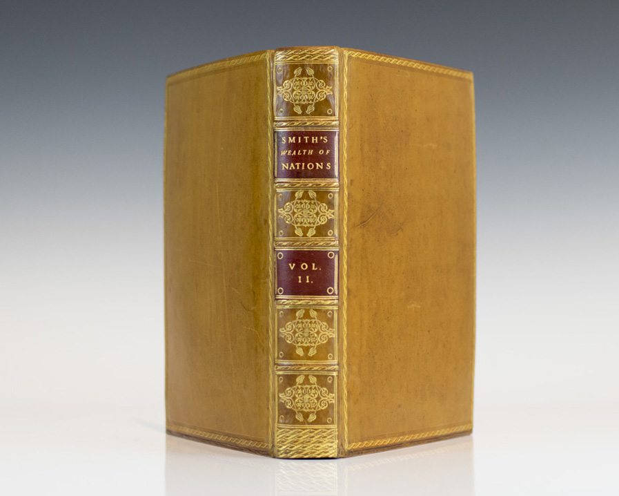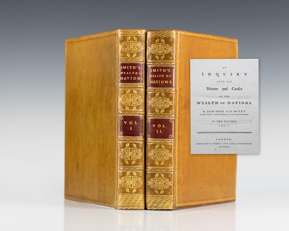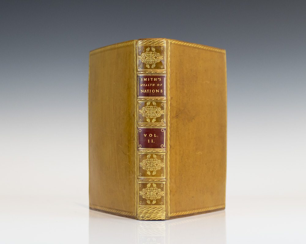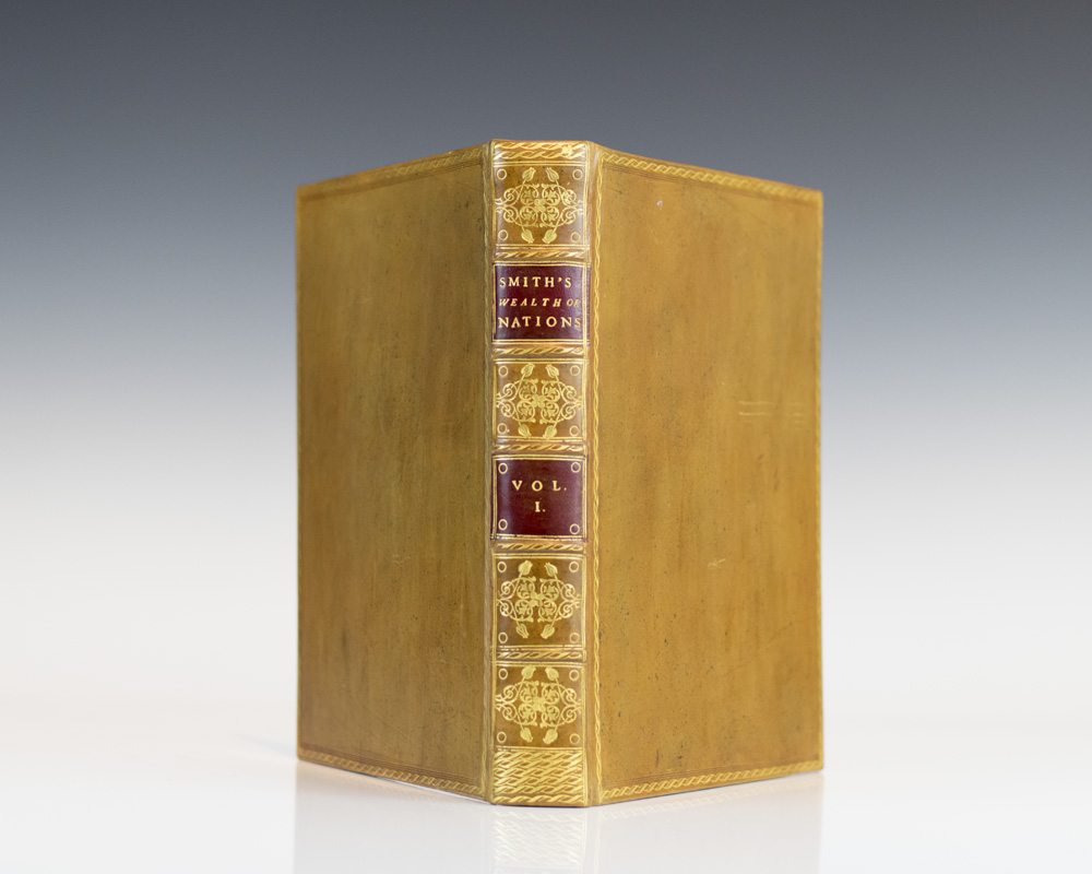 First edition of the Adam Smith's magnum opus and cornerstone of economic thought. Quarto, 2 volumes. Bound in full brown calf, elaborately gilt-decorated spines, red morocco spine labels. In near fine condition. Remarkably clean throughout with some light toning to the title page of volume one and small stamp on the half-title page of volume II. An exceptional example of this landmark work.