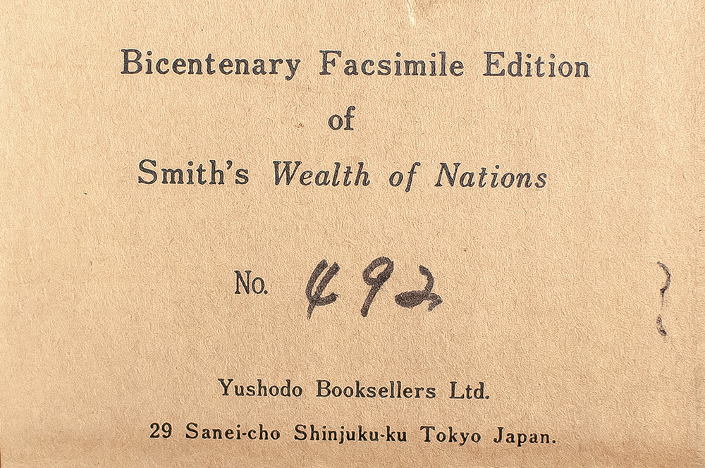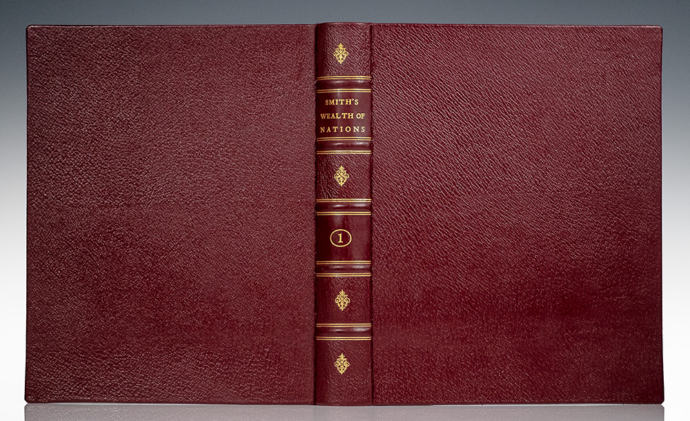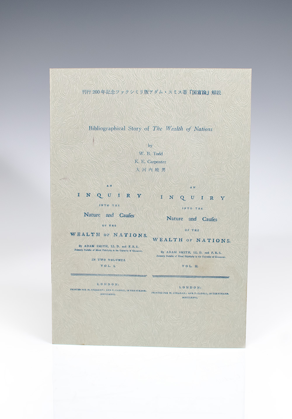 Bicentenary edition of Adam Smith's magnum opus and cornerstone of economic thought. Quarto, 2 volumes, bound in full brown morocco with gilt titles and tooling to the spine in six compartments within raised bands, marbled endpapers. One of one thousand copies, this is number 492. In fine condition. Housed in a custom cloth slipcase. Accompanied by a small booklet printed in Japanese by W.B. Todd and K.E. Carpenter titled 'Bibliographical Story of The Wealth of Nations' laid in and the original numbered shipping box. An exceptional example of this landmark work.