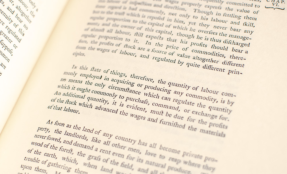 First published in 1776, Adam Smith's masterpiece The Wealth of Nations, is the foundation of modern economic thought and remains the single most important account of the rise of, and the principles behind, modern capitalism. It took Smith ten years to produce An Inquiry into the Wealth of Nations. His commentary during such an incremental time, the first years of the Industrial Revolution, sought to reform outdated theories of mercantilist and physiocratic economic thought with broader concepts that we are all familiar with today, such as the division of labor, productivity, and free markets. An important theme that persists throughout the work is the idea that the economic system is automatic, and, when left with substantial freedom, able to regulate itself. This is often referred to as the “invisible hand.” The ability to self-regulate and to ensure maximum efficiency, however, is limited by a number of external forces and “privileges” extended to certain members of the economy at the expense of others. The 1776 publication of An Inquiry into The Wealth of Nations was the first of only five editions that were published in Adam Smith’s lifetime and greatly influenced a number of economists and philosophers of his time and those that followed, including Jean-Baptiste Say, Alexander Hamilton, Thomas Malthus, and Ludwig von Mises. "The history of economic theory up to the end of the nineteenth century consists of two parts: the mercantilist phase which was based not so much on a doctrine as on a system of practice which grew out of social conditions; and the second phase which saw the development of the theory that the individual had the right to be unimpeded in the exercise of economic activity. While it cannot be said that Smith invented the latter theory...his work is the first major expression of it. He begins with the thought that labour is the source from which a nation derives what is necessary to it. The improvement of the division of labour is the measure of productivity and in it lies the human propensity to barter and exchange...Labour represents the three essential elements-wages, profit and rent-and these three also constitute income. From the working of the economy, Smith passes to its matter -'stock'- which encompasses all that man owns either for his own consumption or for the return which it brings him. The Wealth of Nations ends with a history of economic development, a definitive onslaught on the mercantile system, and some prophetic speculations on the limits of economic control...The Wealth of Nations is not a system, but as a provisional analysis it is complete convincing. The certainty of its criticism and its grasp of human nature have made it the first and greatest classic of modern economic thought" (PMM).