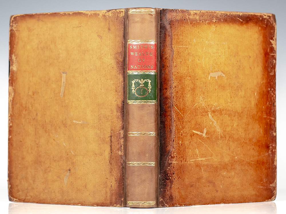 Rare second edition of Adam Smith's magnum opus and cornerstone of economic thought, one of only 500 copies. Quarto, 2 volumes, bound in full brown calf, morocco spine labels. In near fine condition, bookplate to the front pastedown, two tears to volume one repaired, rebacked. Remarkably clean throughout with some light toning. Housed in a custom slipcase. An exceptional example of this landmark work.