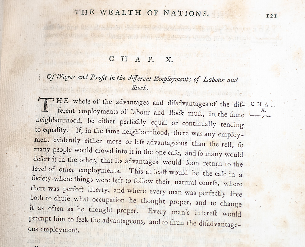 First published in 1776, Adam Smith's masterpiece The Wealth of Nations, is the foundation of modern economic thought and remains the single most important account of the rise of, and the principles behind, modern capitalism. It took Smith ten years to produce An Inquiry into the Wealth of Nations. His commentary during such an incremental time, the first years of the Industrial Revolution, sought to reform outdated theories of mercantilist and physiocratic economic thought with broader concepts that we are all familiar with today, such as the division of labor, productivity, and free markets. An important theme that persists throughout the work is the idea that the economic system is automatic, and, when left with substantial freedom, able to regulate itself. This is often referred to as the “invisible hand.” The ability to self-regulate and to ensure maximum efficiency, however, is limited by a number of external forces and “privileges” extended to certain members of the economy at the expense of others. The 1776 publication of An Inquiry into The Wealth of Nations was the first of only five editions that were published in Adam Smith’s lifetime and greatly influenced a number of economists and philosophers of his time and those that followed, including Jean-Baptiste Say, Alexander Hamilton, Thomas Malthus, and Ludwig von Mises. "The history of economic theory up to the end of the nineteenth century consists of two parts: the mercantilist phase which was based not so much on a doctrine as on a system of practice which grew out of social conditions; and the second phase which saw the development of the theory that the individual had the right to be unimpeded in the exercise of economic activity. While it cannot be said that Smith invented the latter theory...his work is the first major expression of it. He begins with the thought that labour is the source from which a nation derives what is necessary to it. The improvement of the division of labour is the measure of productivity and in it lies the human propensity to barter and exchange...Labour represents the three essential elements-wages, profit and rent-and these three also constitute income. From the working of the economy, Smith passes to its matter -'stock'- which encompasses all that man owns either for his own consumption or for the return which it brings him. The Wealth of Nations ends with a history of economic development, a definitive onslaught on the mercantile system, and some prophetic speculations on the limits of economic control...The Wealth of Nations is not a system, but as a provisional analysis it is complete convincing. The certainty of its criticism and its grasp of human nature have made it the first and greatest classic of modern economic thought" (PMM).