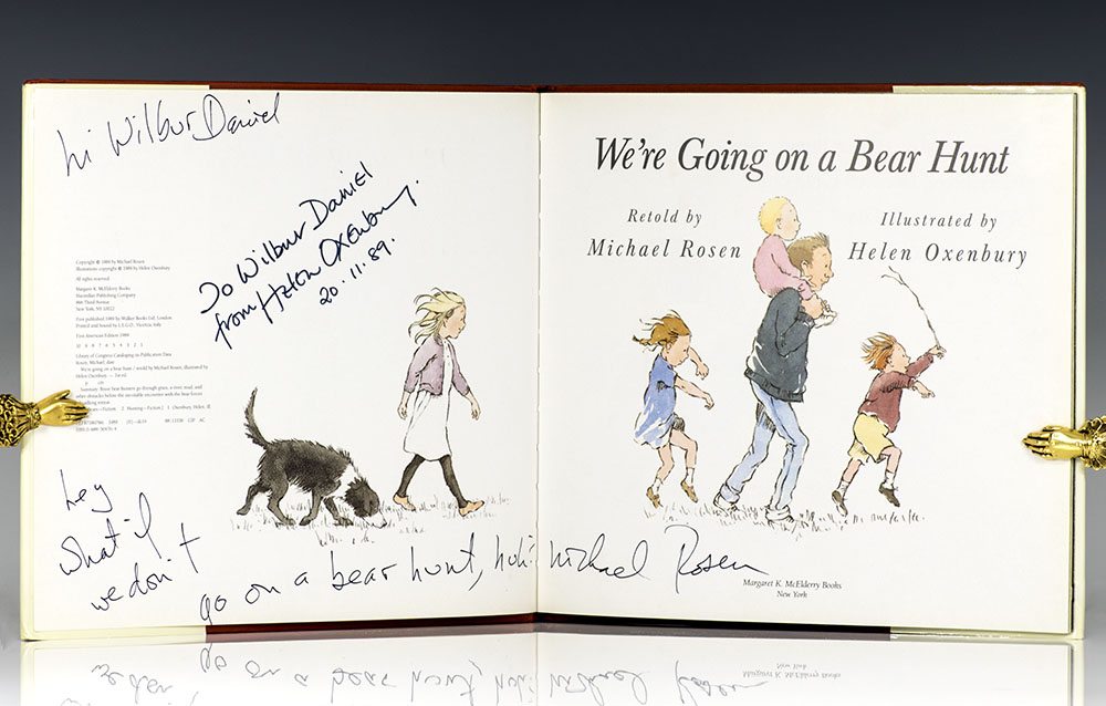 "Hey what if we don't go on a bear hunt, huh?"; First Edition of Michael Rosen's We're Going On A Bear Hunt; Inscribed by Michael Rosen and Helen Oxenbury