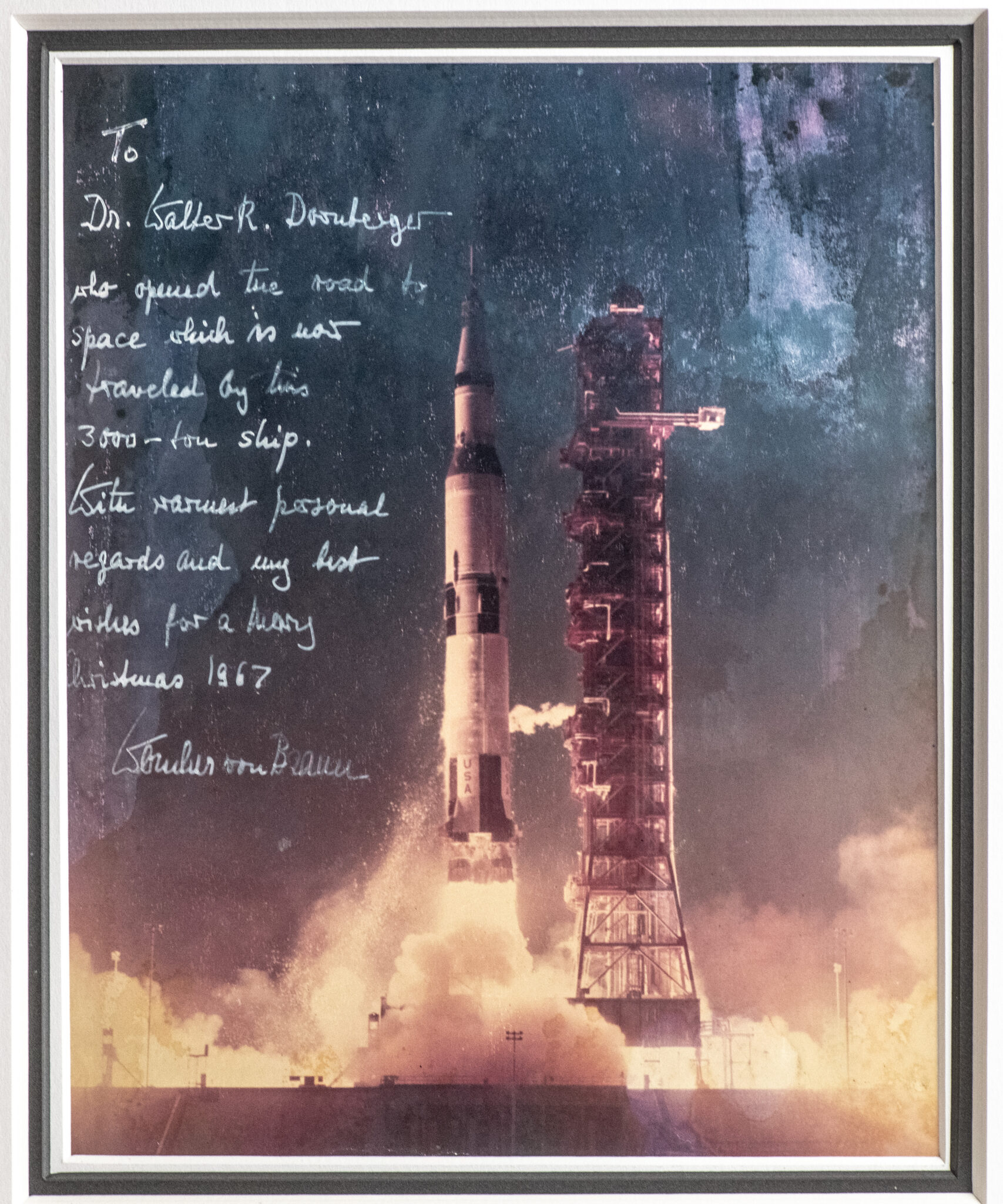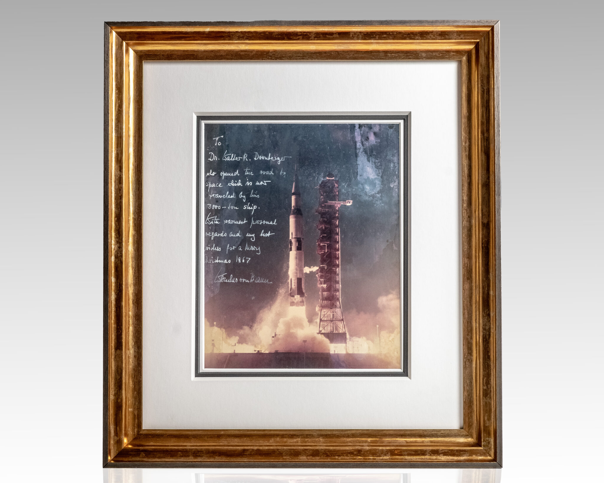 Rare color photograph of the launch of Apollo 4, the first uncrewed test flight of the Saturn V rocket that later carried astronauts to the Moon, lengthily inscribed by Wernher von Braun to the Leader of Germany's V-2 Rocket Program, "To Dr. Walter R. Dornberger, who opened the road to space which is now traveled by this 3000-ton ship. With warmest personal regards and my best wishes for a Merry Christmas 1967, Wernher von Braun." The recipient, Major-General Dr. Walter Robert Dornberger (1895-1980) was a German Army artillery officer and a key leader of Nazi Germany's V-2 rocket program at PeenemA1/4nde. After World War II, he was brought to the United States under Operation Paperclip, where he avoided prosecution for war crimes and spent decades working in senior aerospace roles with Bell Aircraft and Boeing. He played a major role in the creation of the North American X-15 aircraft and was a key consultant for the Boeing X-20 Dyna-Soar project. He also had a role in the creation of ideas and projects, which, in the end, led to the creation of the Space Shuttle. Dornberger also developed Bell's ASM-A-2, the world's first guided nuclear air-to-surface missile developed for the Strategic Air Command. In near fine condition. Triple matted and framed. The entire piece measures 17 by 14.75 inches.