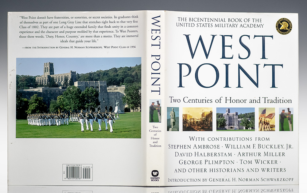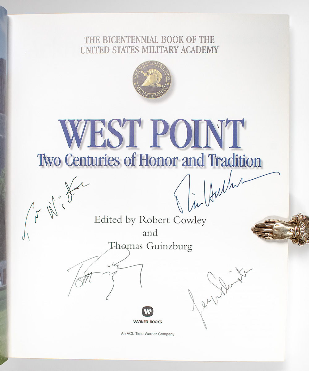 First edition of this commemorative history of the famous military academy. Quarto, original cloth, illustrated with over 400 photographs and drawings, including famous and rarely seen paintings, historic letters from cadets, treasured athletic memorabilia, and other artifacts. Signed by Tom Wicker, Thomas Guinzburg, David Halberstam, and one additional contributor on the title page. Fine in a fine dust jacket. Accompanied by the original West Point 200th anniversary invitation which has been inscribed, "... you may get a second invite for it. See ya there, Rich."