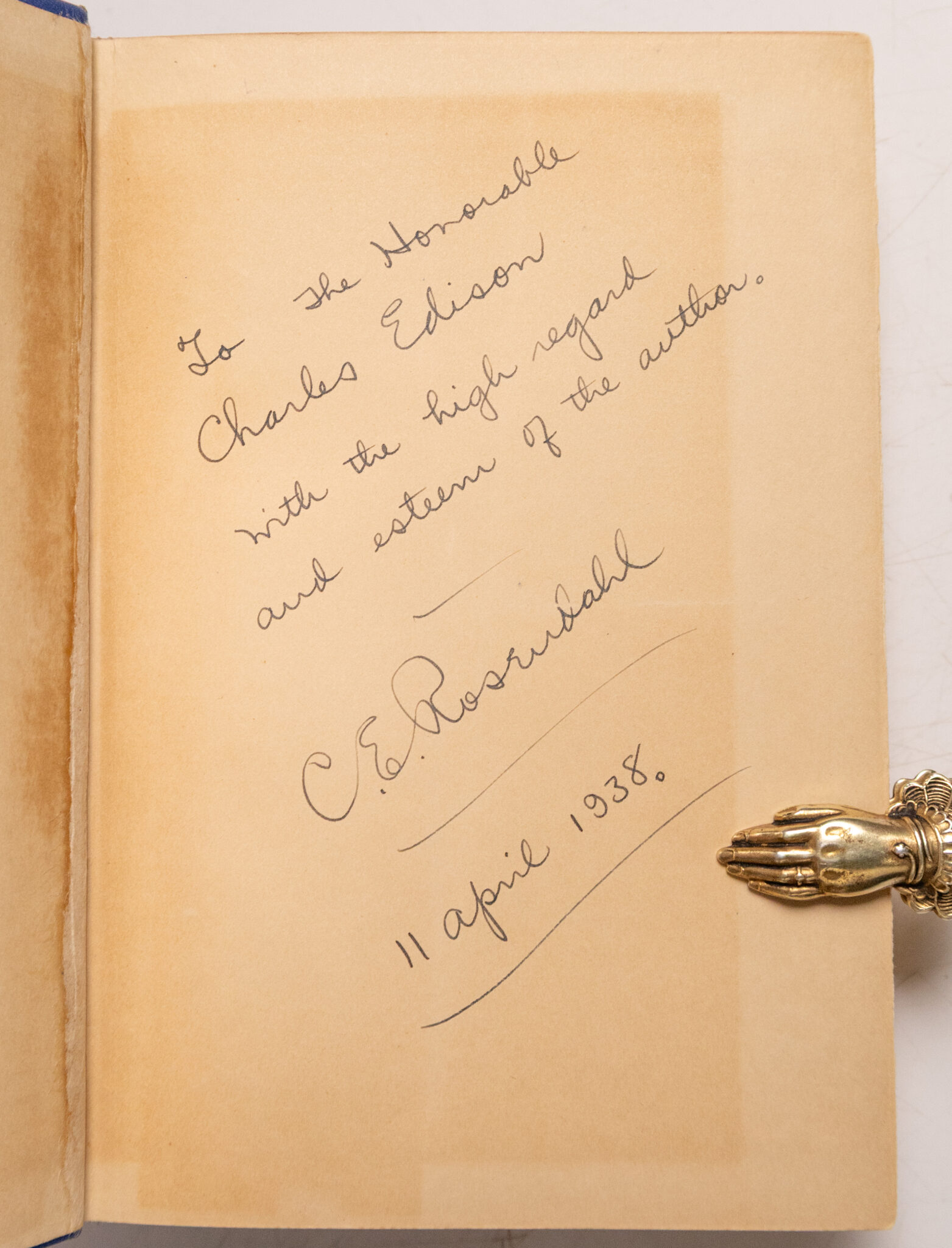 First edition of this spirited defense of the airship that calls for America to secure and maintain airship superiority. Octavo, original publisher's blue cloth with gilt titles to the spine and front panel, top stain red, illustrated with 16 black and white photographic plates. Presentation copy, inscribed by the author on the front free endpaper, "To the Honorable Charles Edison with the high regard and esteem of the author. C. E. Rosendahl 11 April 1938." The recipient, Charles Edison (1890-1969), was the son of inventor Thomas A. Edison. He served as Secretary of the Navy in 1940 and as Governor of New Jersey from 1941 to 1944. Very good in a very good dust jacket, bookplate to the front pastedown. Rare and desirable signed.
