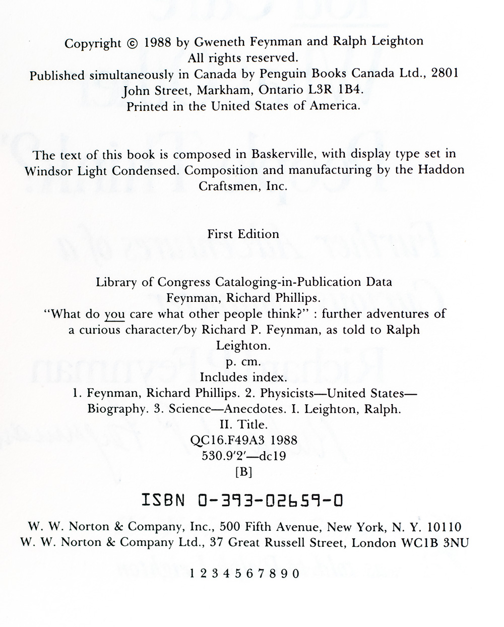First Edition of "What Do You Care What Other People Think?": Further Adventures of a Curious Character; signed by Richard P. Feynman