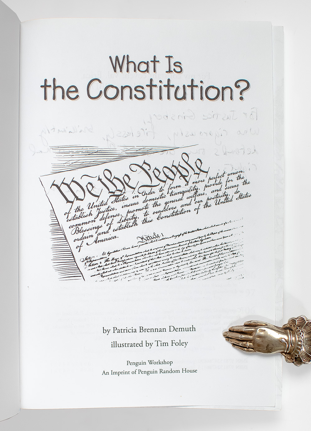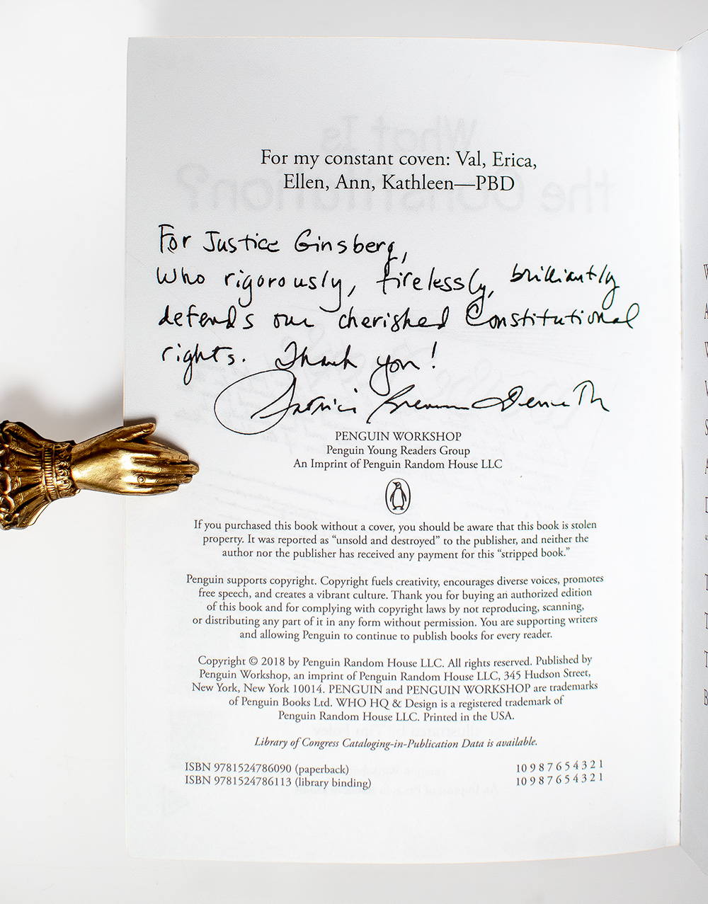 "For Justice Ginsburg, Who rigorously, tirelessly, brilliantly defends our cherished Constitutional rights. Thank you!": First Edition of What Is the Constitution?; inscribed by Patricia Brennan Demuth to Ruth Bader Ginsburg