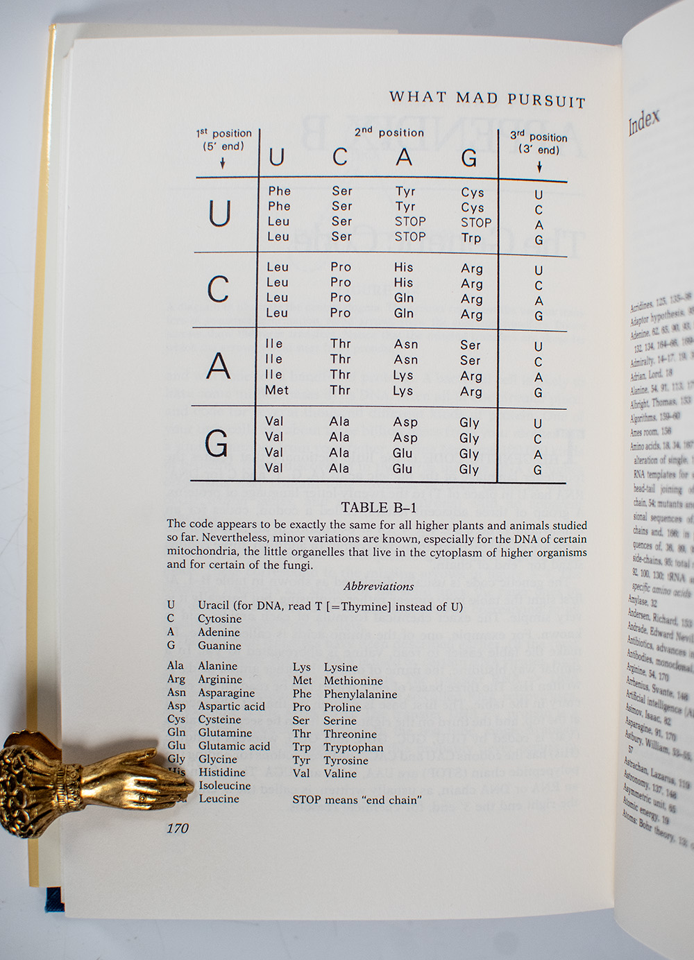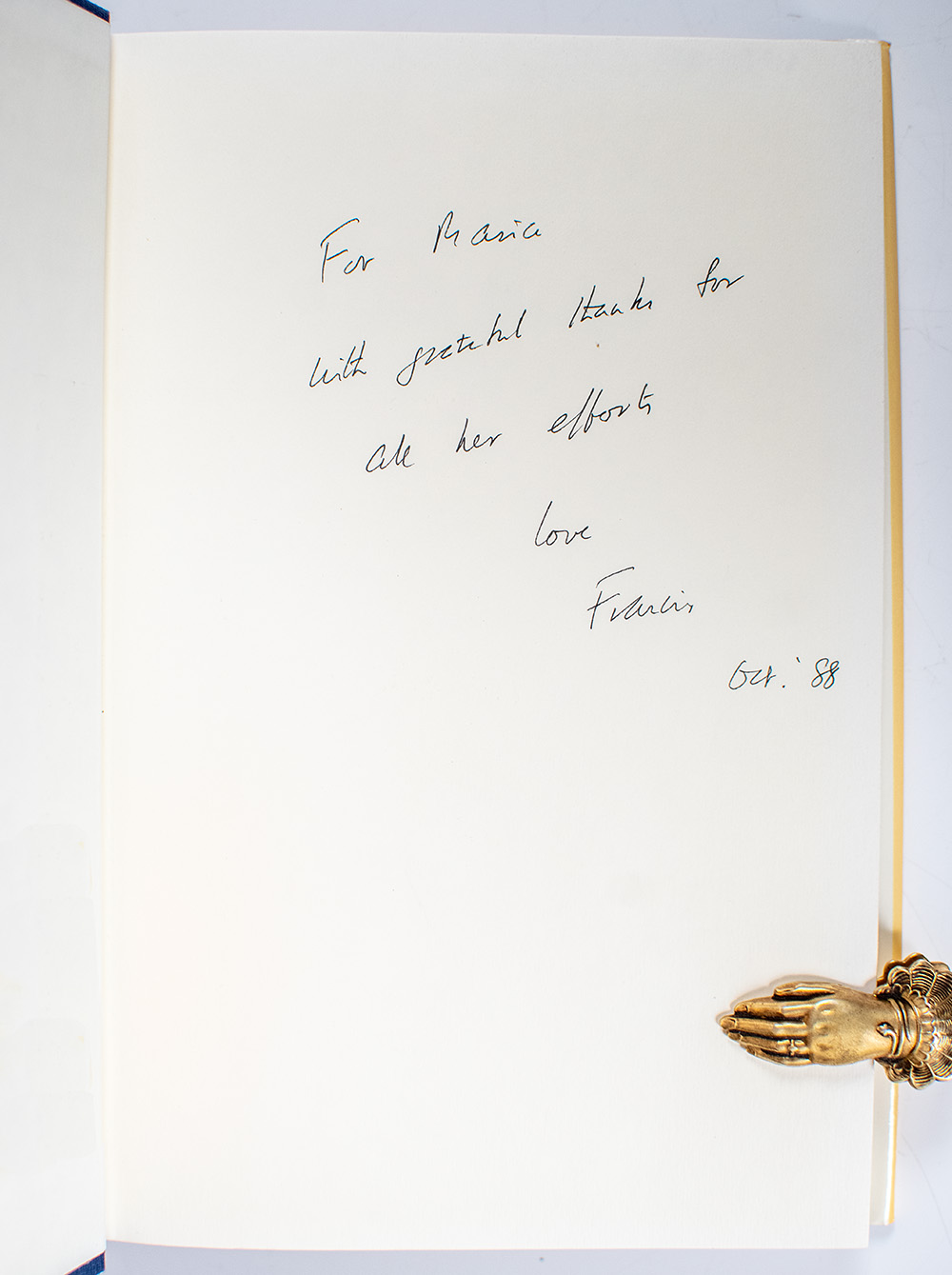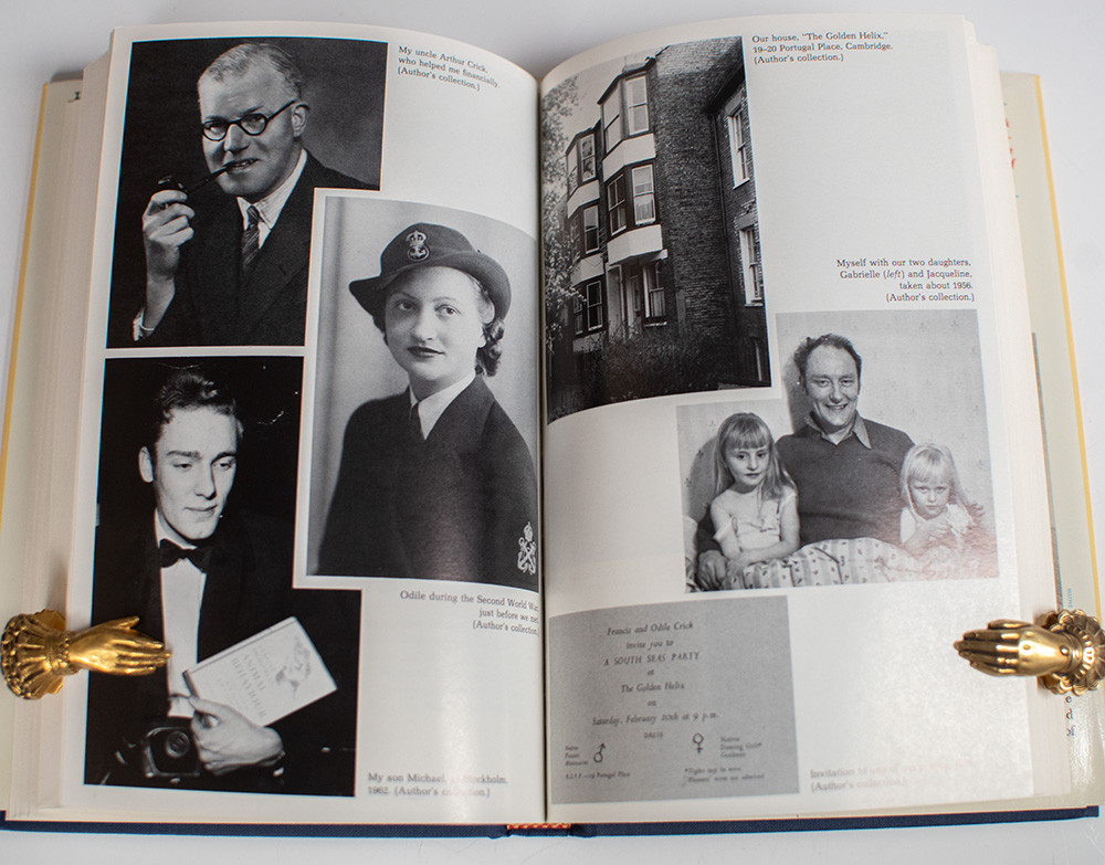 First edition of Crick's autobiography. Octavo, original cloth, illustrated. Association copy, inscribed by Francis Crick in the year of publication to his personal assistant on the front free endpaper, "For Maria with grateful thanks for all her efforts love Francis." The recipient was also thanked in the acknowledgements on page xiii, "Finally, my warmest thanks to my secretary, Betty ("Maria") Lang, who has coped splendidly with the many successive versions and all the tedious chores associated with producing a manuscript." Maria Lang was employed at the Salk Institute from 1977 to her retirement in 1994, where her organizational skills and dedication facilitated Crick’s research activities. Crick, an advocate of open marriage, enjoyed with Lang a sexual relationship between 1981 and 1992. Fine in a near fine dust jacket. Jacket design by William Davis. A remarkable association.