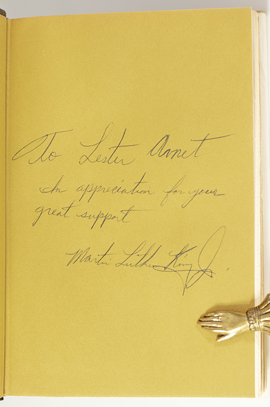 First edition of King's "last grand expression of his vision" (Cornel West). Octavo, original half cloth, illustrated with eight pages of black-and-white photogravures. Presentation copy, inscribed by the author on the front free endpaper, "To Lester Arnet In appreciation for your great support Martin Luther King Jr." Fine in a near fine dust jacket. Jacket design by Ronald Clyne. Jacket photograph of Martin Luther King, Jr. by Bob Fitch. Housed in a custom half morocco clamshell box.
