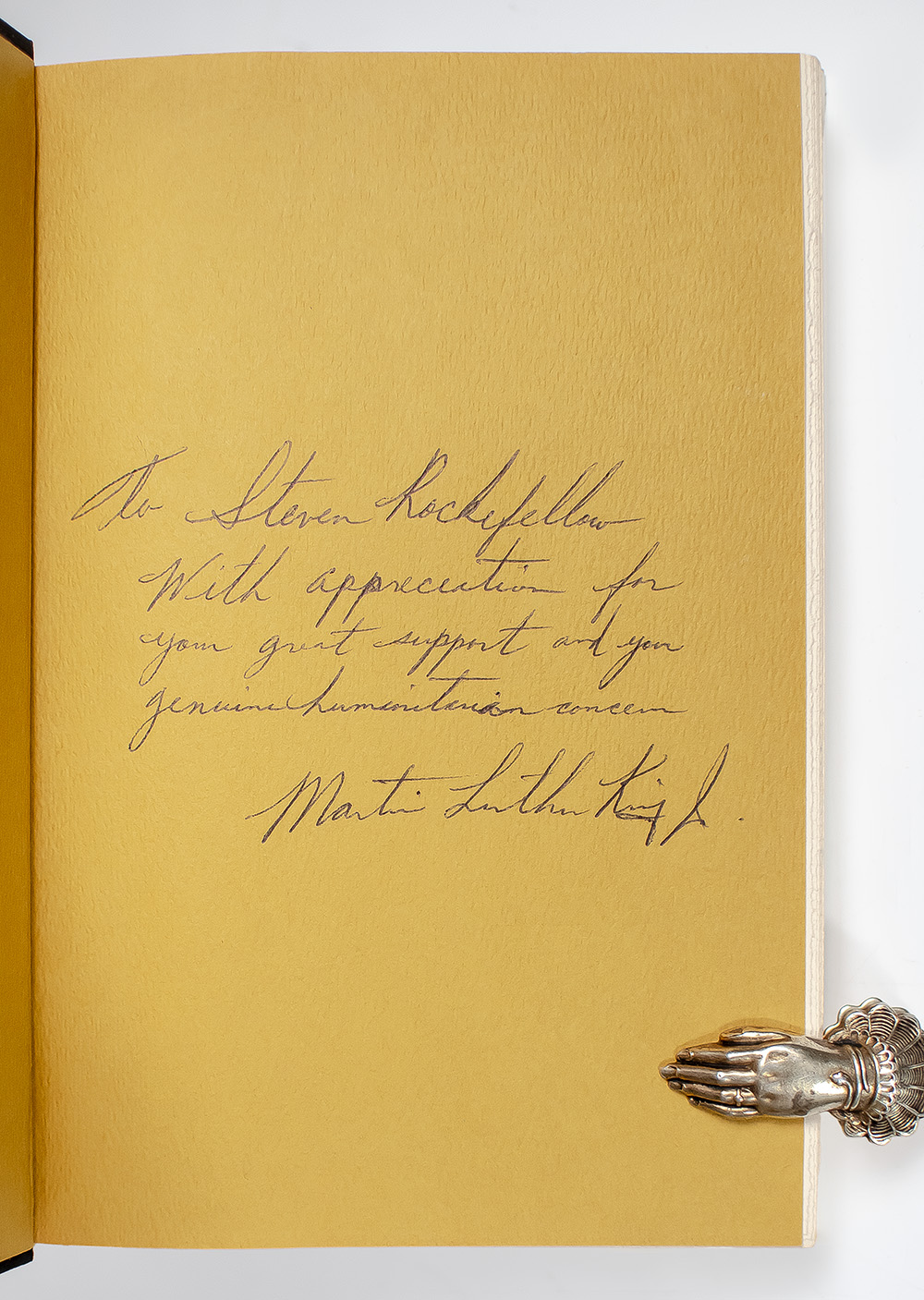 First edition of King's "last grand expression of his vision" (Cornel West). Octavo, original half cloth, illustrated with eight pages of black-and-white photogravures. Presentation copy, warmly inscribed by the author on the front free endpaper, "To Steven Rockefeller, With appreciation for your great support and your genuine humanitarian concern Martin Luther King, Jr." Fine in a fine dust jacket. Jacket design by Ronald Clyne. Jacket photograph of Martin Luther King, Jr. by Bob Fitch. Photograph of the Selma March to the front panel by Steve Schapiro. Housed in a custom half morocco clamshell box. Rare in this condition and signed.