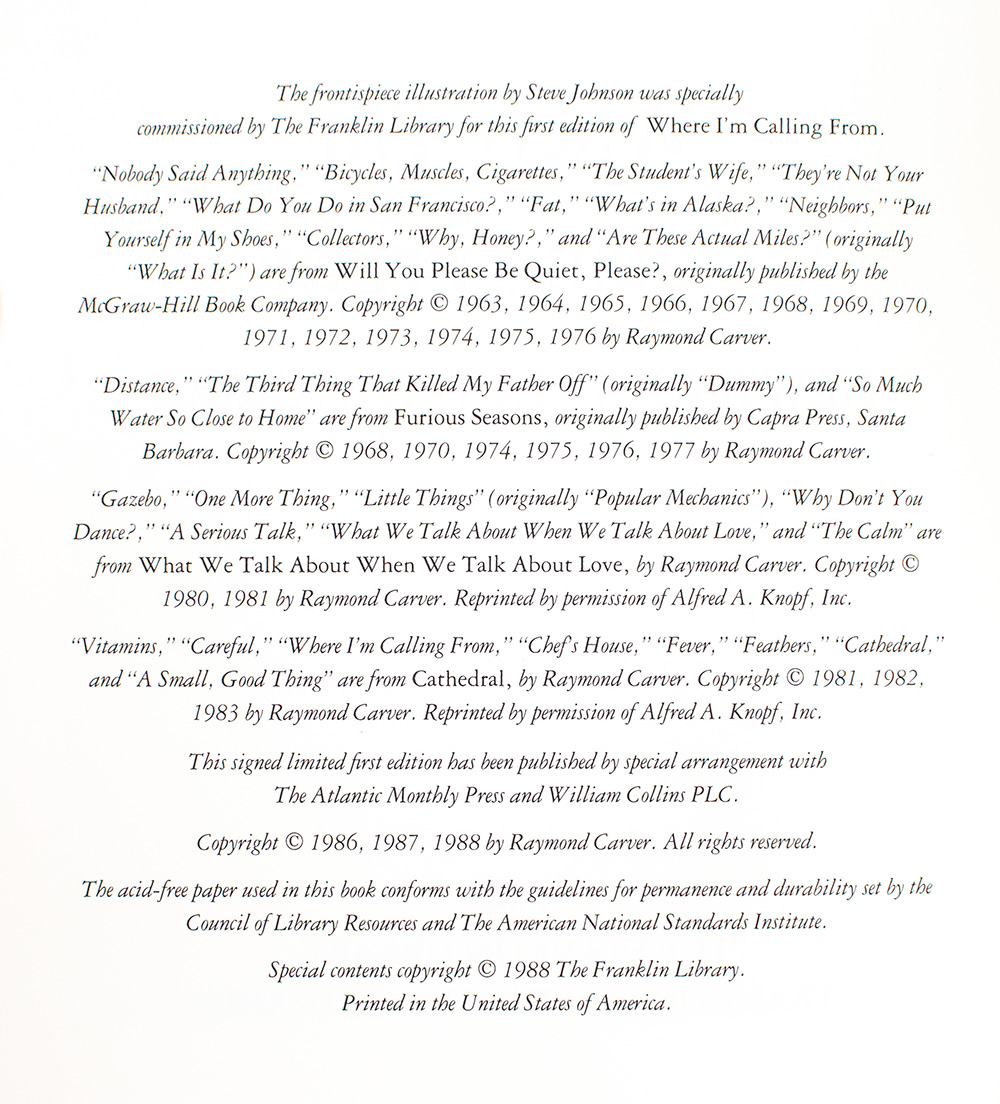 Limited First Edition of Where I'm Calling From; Signed by Raymond Carver