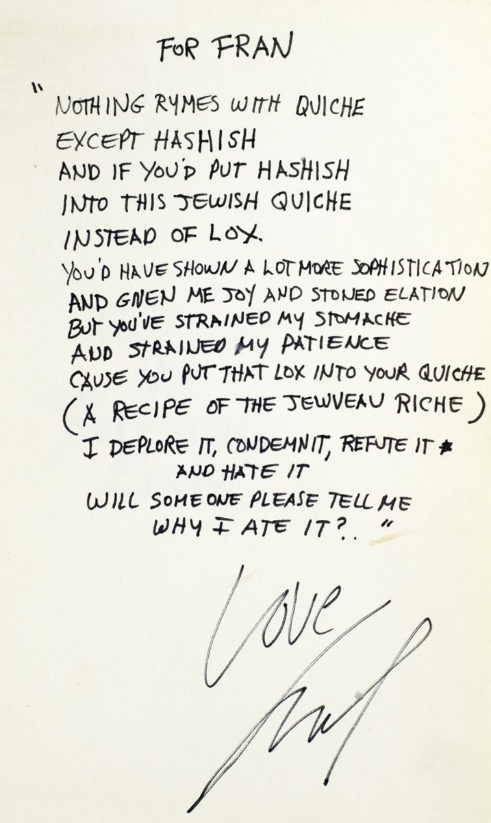 First edition of the author’s first collection of children’s poetry. Small quarto, original brown cloth. Stated first edition on the copyright page. Inscribed by Shel Silverstein on the front free endpaper, with an original full page poem, "For Fran "Nothing rhymes with quiche/ Except Hashish/ And if you'd hashish/ Into this Jewish Quiche/ Instead of lox/ You'd have shown a lot more sophistication/ And given me joy and stoned elation/ But you've strained my stomache (ics)/ And strained my patience/ Cause you put that lox into your quiche/ (A receipe of the Jewveau Riche)/ I deplore it, condemn it, Refute it/ and hate it/ Will someone please tell me/ Why I ate it?" Love Shel." Fine in a near fine dust jacket with some light toning and wear. Housed in a custom half morocco clamshell box.