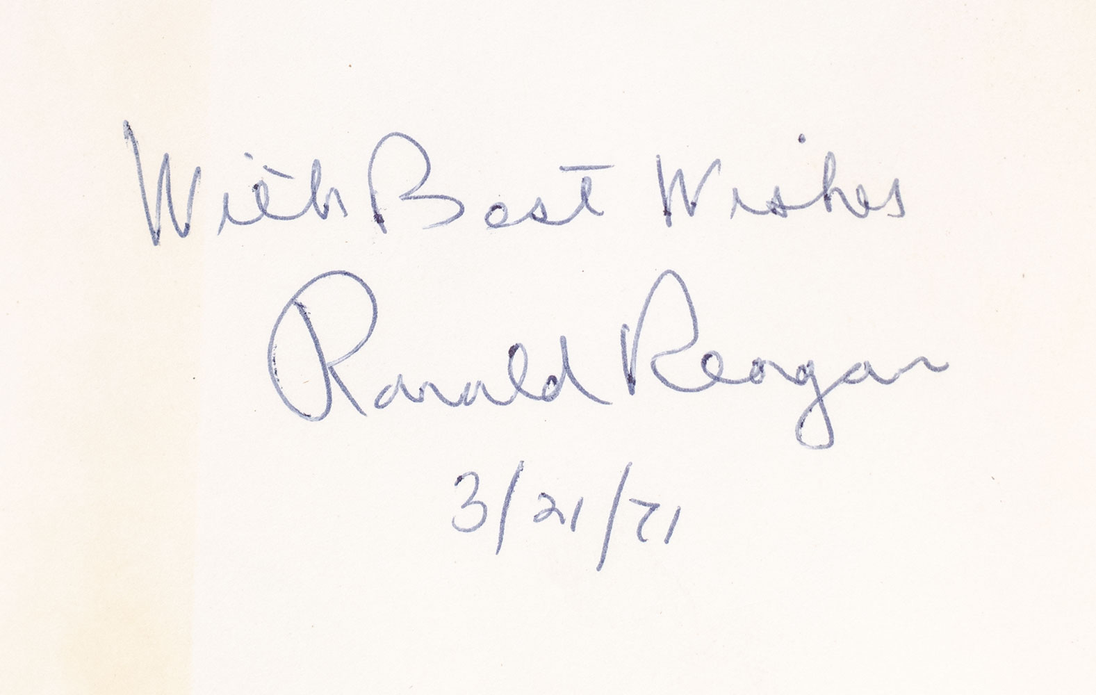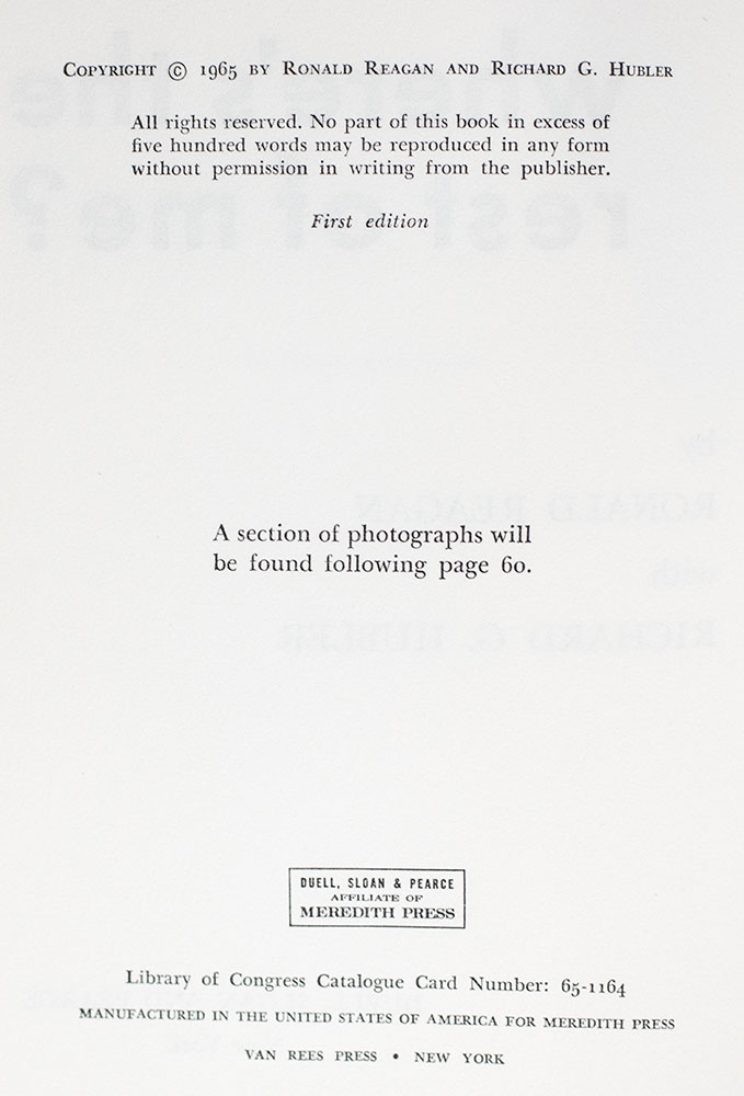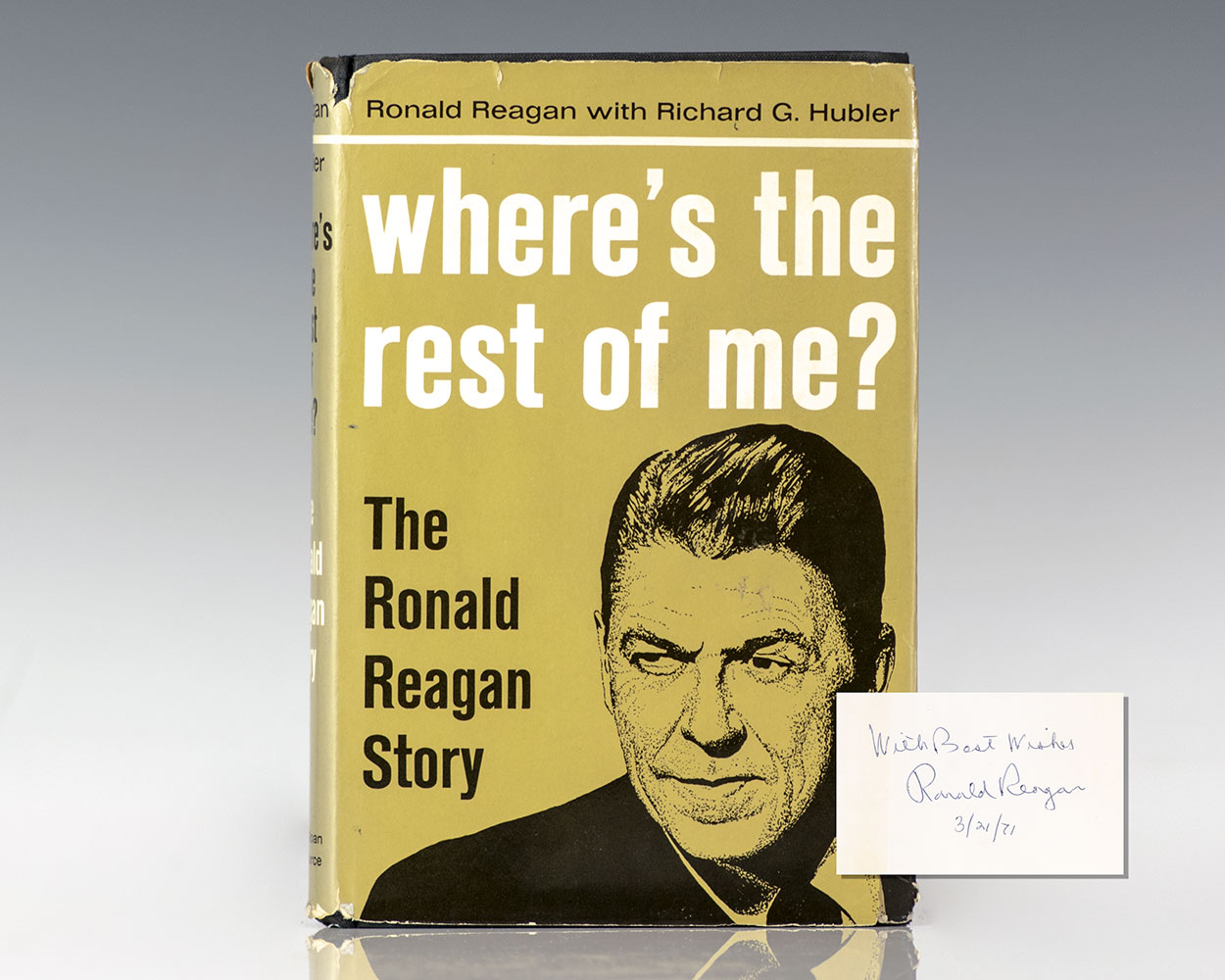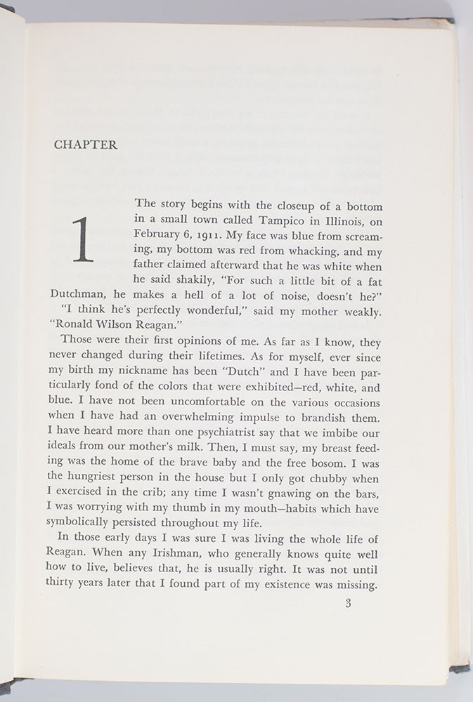 First edition of Reagan's biography covering his years in Hollywood. Octavo, original black cloth, illustrated. Presentation copy, inscribed by the author on the front free endpaper in a contemporary hand, "With Best Wishes Ronald Reagan 3/21/71." Near fine in a very good dust jacket, contemporary inscription to the front free endpaper. Jacket design Ned Glattauer.