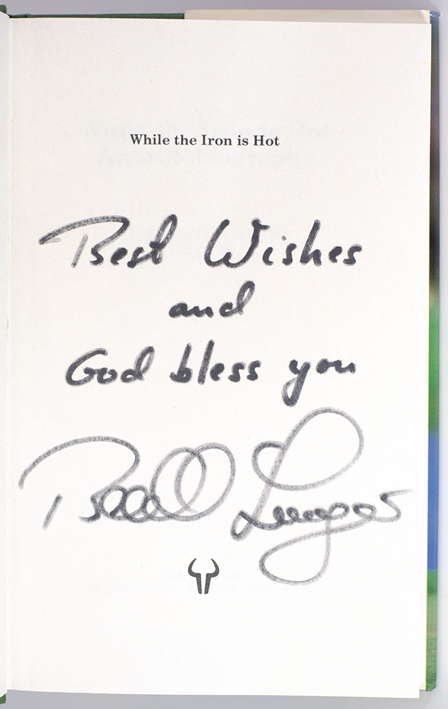 First edition of the autobiography of the two-time Master's champion. Octavo, original cloth, illustrated. Boldly signed by the author on the half-title page, "Best Wishes and God bless you Bernhard Langer." Fine in a near fine dust jacket. Written with Bill Elliot.