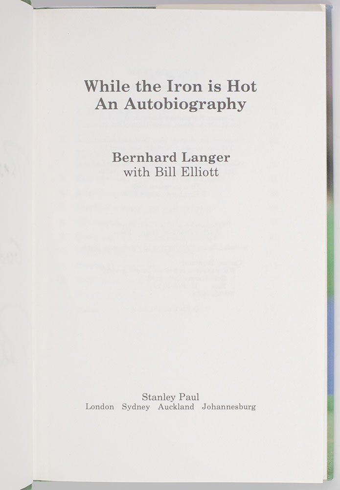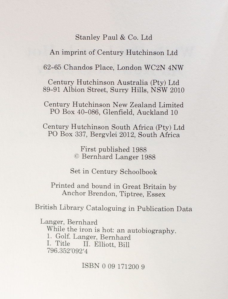 First Edition of Bernhard Langer's Autobiography While the Iron is Hot; Signed by Him