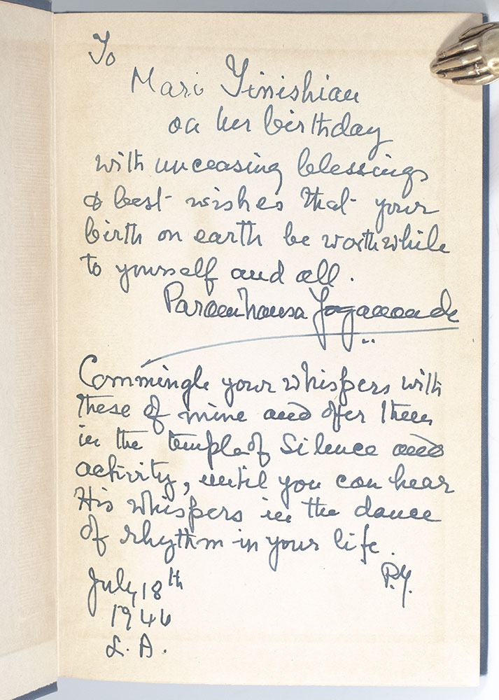 Paramhansa Yogananda's classic collection of mantras, or prayer-demands, with a full page inscription, fourth edition. Octavo, original cloth with gilt titles to the spine and front panel, frontispiece portrait of the author. Presentation copy, inscribed by the author on the front free endpaper, "To Mari Yinishiau on her birthday with unceasing blessings & best wishes that your birth on earth be worthwhile to yourself and all. Paramhansa Yogananda. Commingle your whispers with these of mine and offer them in the temple of Silence and activity, until you can hear His whispers in the dance of rhythm in your life. P.Y. July 18th 1946 L.A." In near fine condition. An exceptional inscription, books signed by Paramhansa Yogananda are scarce.