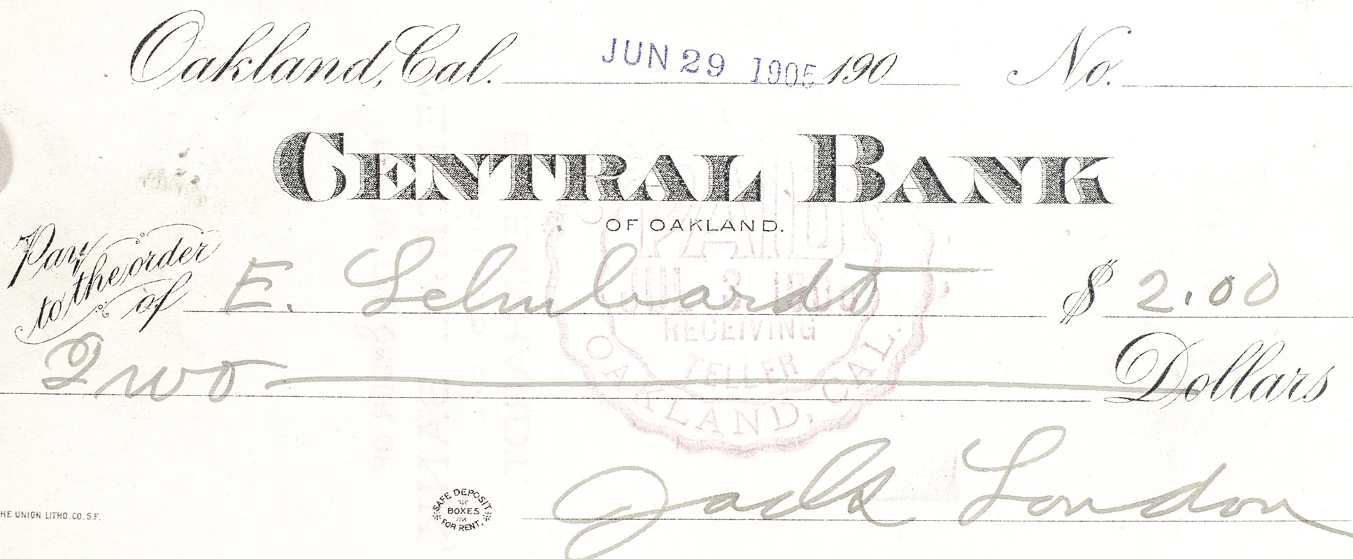 First edition of London's beloved novel. Octavo, original pictorial cloth with white and gilt lettering. Frontispiece and 6 color plates by Charles Livingston Bull. With usual cancel title page. BAL notes that the cancel page occurs printed on either wove or on laid paper (the rest of the text sheets are all laid paper) but no priority or other significance. BAL 11896. In near fine condition. Accompanied by a rare Oakland Central Bank check signed by London. Dated June 29 1905, the check is paid to the order of “E. Selmhardt $2.00 Jack London.” In 1905, London purchased a 1,000-acre ranch in Glen Ellen, Sonoma County, California, on the eastern slope of Sonoma Mountain. Desirous that the ranch become a successful business enterprise, he continued to write purely as a commercial enterprise. The ranch was ultimately an economic failure, but it was during this period that London published some of his best-known works including White Fang (1906), The Iron Heel (1908), and Adventure (1911). In near fine condition.
