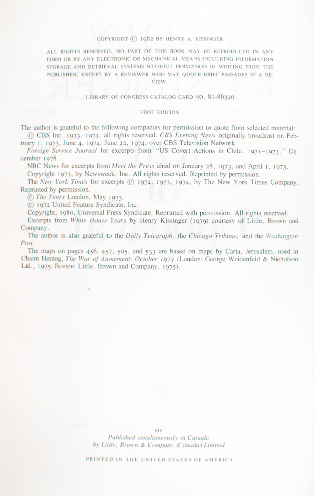 First editions of Kissinger’s monumental New York Times best-selling work and its sequel. Octavo, two volumes, original cloth, illustrated with black and white photographs. From the library of fellow Secretary of State Madeleine K. Albright. Madeleine K. Albright was the first woman to serve as the U.S. Secretary of State. She acted under President Bill Clinton from 1997 to 2001, leading the United States through foreign policy in the Middle East with the endorsement of military action in Iraq. At the 1998 NATO summit, Albright coined the “3 Ds” of NATO, “which is no diminution of NATO, no discrimination and no duplication – because I think that we don’t need any of those three “Ds” to happen.” After her tenure as Secretary of State, she served as chair of the consulting Albright Stonebridge Group and was the Michael and Virginia Mortara Endowed Distinguished Professor in the Practice of Diplomacy at Georgetown University’s School of Foreign Service. For Albright’s contributions to foreign policy and relations that defined a century, President Barack Obama awarded her the Presidential Medal of Freedom in 2012. Each volume is very good in a very good dust jacket. With Albright's bookplate to each pastedown. Jacket designs by Paul Bacon. Author photographs by Tom Blau and Bern Schwartz. An exceptional association.