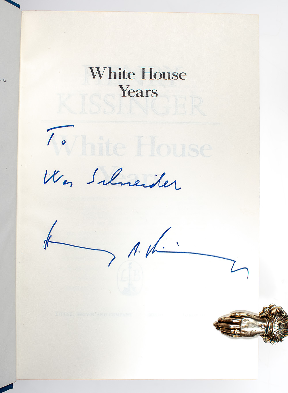 First edition of Kissinger’s National Book Award-winning memoir. Octavo, original blue cloth, gold endpapers, illustrated with 48 pages of photographs and maps. Presentation copy, inscribed by the author on the half-title page, "To Wes Schneider Henry A. Kissinger." Near fine in a near fine dust jacket. Jacket design by Paul Bacon. Author photograph by Tom Blau.
