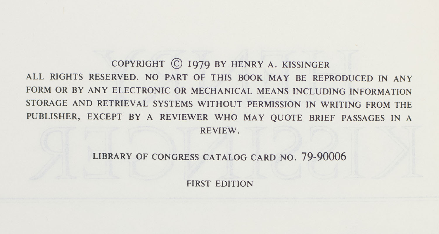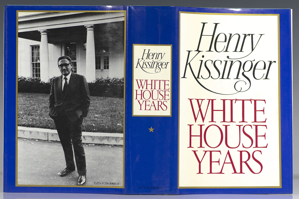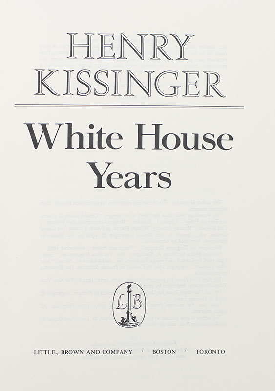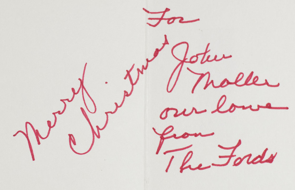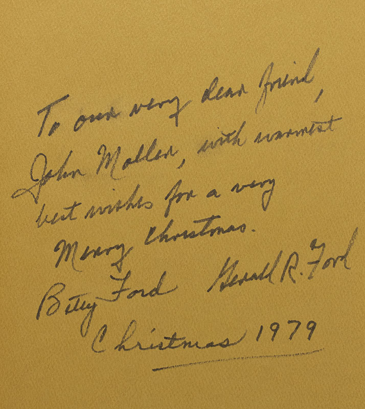 First edition of Kissinger's National Book Award-winning memoir. Octavo, original blue cloth, illustrated with 48 pages of photographs and maps. Association copy, inscribed by President Gerald Ford and signed by First Lady Betty Ford on the front free endpaper in the year of publication, "To our very dear friend John Moller, with warmest best wishes for a very Merry Christmas Gerald R. Ford" and "Betty Ford Christmas 1979." With a small Christmas card inscribed by Betty Ford tipped in which reads, "Merry Christmas John Moller our love from The Fords." Kissinger served as United States Secretary of State and National Security Advisor under the presidential administrations of both Nixon and Ford. When Ford assumed office, he replaced every member of the former Nixon Cabinet with the exceptions of Kissinger and Secretary of the Treasury William E. Simon, a dramatic reorganization referred to as the "Halloween Massacre". During his tenure in the Ford Administration as United States National Security Advisor Kissinger worked to resolve conflicts in the Middle East, Vietnam, and Indonesia. On January 13, 1977, Ford awarded Kissinger the Presidential Medal of Freedom. Fine in a fine dust jacket. Jacket design by Paul Bacon. Author photograph by Tom Blau. A unique example.