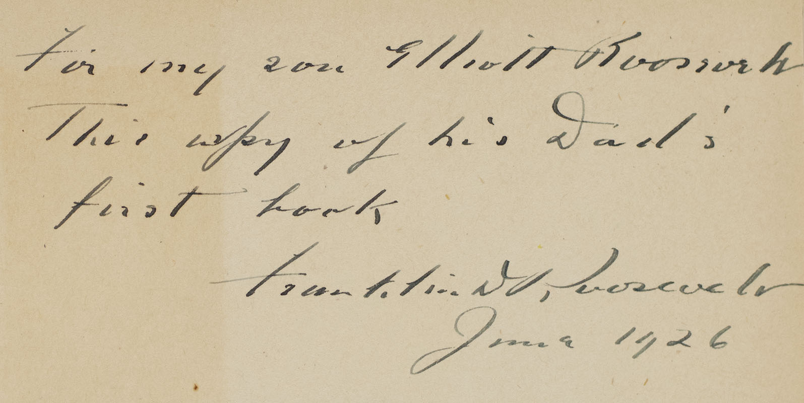 First edition of Franklin Delano Roosevelt's first book, being the text of a lecture delivered by him at Milton Academy on the Alumni War Memorial Foundation on May 18, 1926. Octavo, original cloth. One of one thousand copies printed. Association copy, inscribed by the author on the title page on the occasion of publication (and within a month of the delivery of the lecture) to his son, "For my son Elliott Roosevelt This copy of his Dad's first book Franklin D. Roosevelt June 1926." Additionally signed by Roosevelt on the title page, "Franklin Roosevelt." Elliott was the fourth of Roosevelt's six children, and Eleanor's acknowledged favorite. His future career included military service, involvement in aircraft procurement, and roles as author, rancher, radio station owner, and Mayor of Miami Beach. Near fine in the rare original dust jacket which is in good condition. Housed in a custom cloth chemise and half morocco slipcase. Small bookplate to the pastedown. An exceptional association.