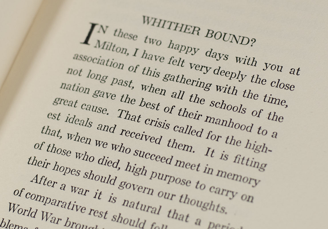 Whither Bound? A Lecture at Milton Academy on the Alumni War Memorial Foundation May 18, 1926.